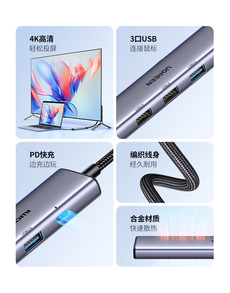 绿联/UGREEN CM478 15495 扩展坞转HDMI拓展坞投屏接口转换器雷电4转接头USB 适用苹果MacBook华为笔记本电脑iPad手机 CM478 15495