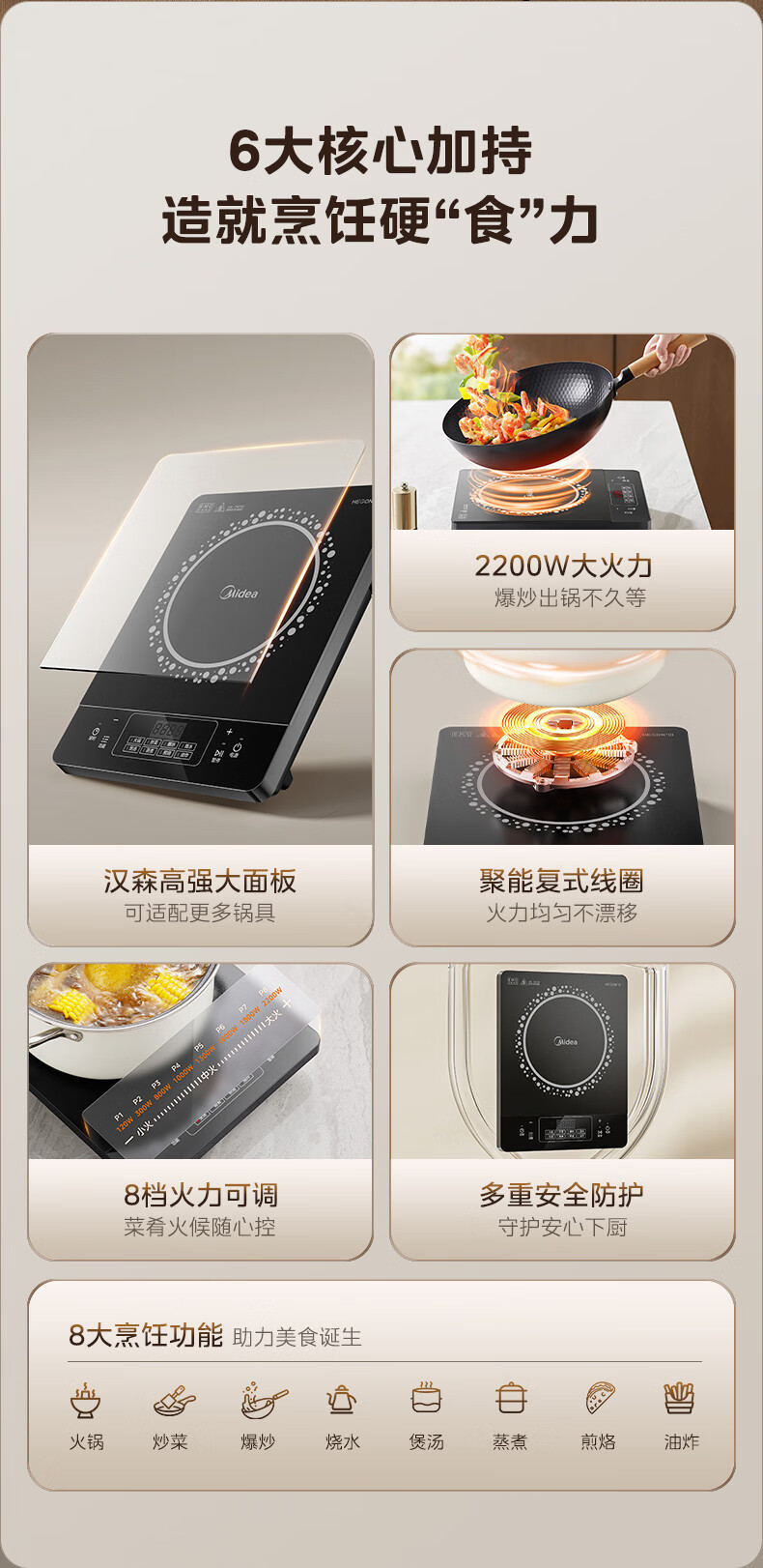 • 商品名称:美的/MIDEA C22-RT22E01 电磁炉电陶炉 2200W大功率家用猛火爆炒耐用面板八档火力纤薄电磁灶火锅炉 C22-RT22E01