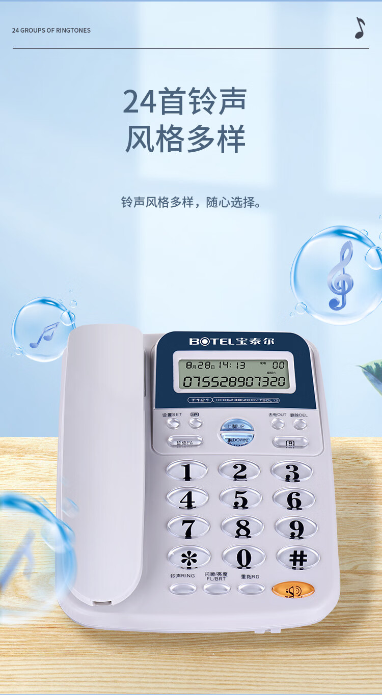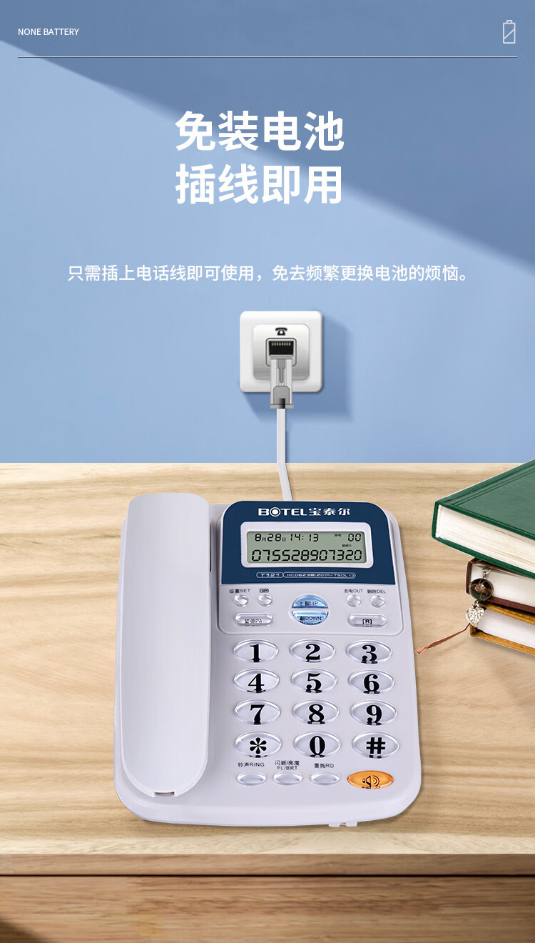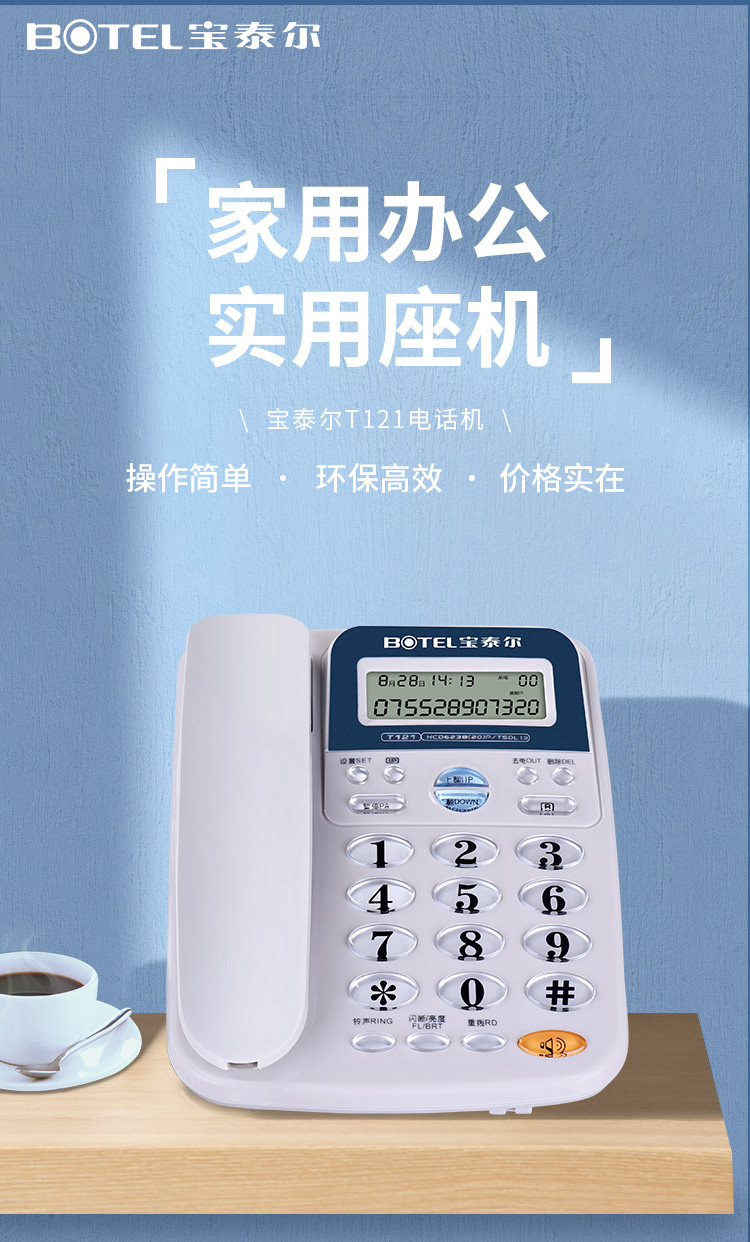 • 商品名称:宝泰尔 T121 电话机座机 固定电话办公家用免电池/大按键 固话机 商务酒店 来电显示T121 蓝色 T121