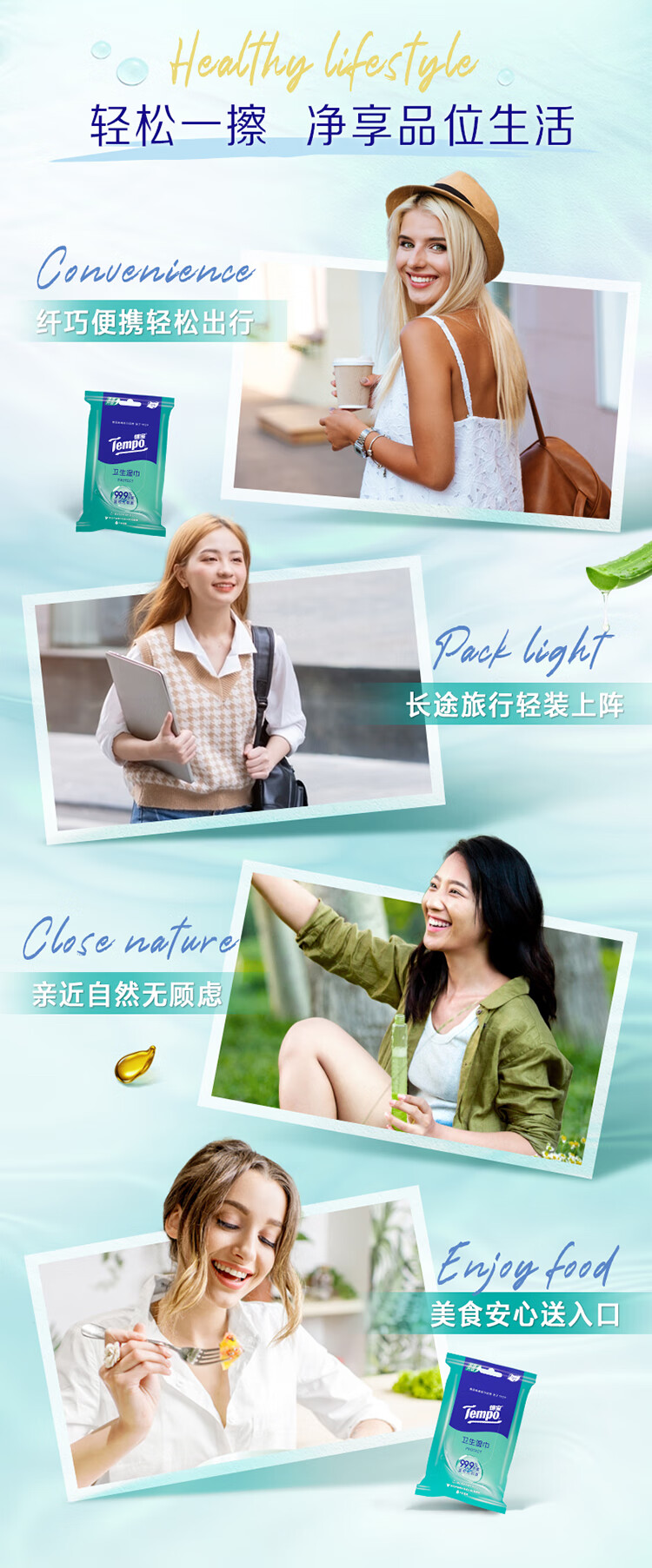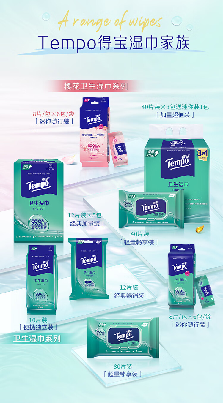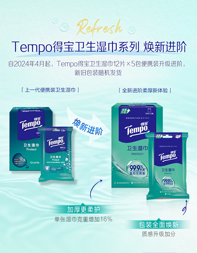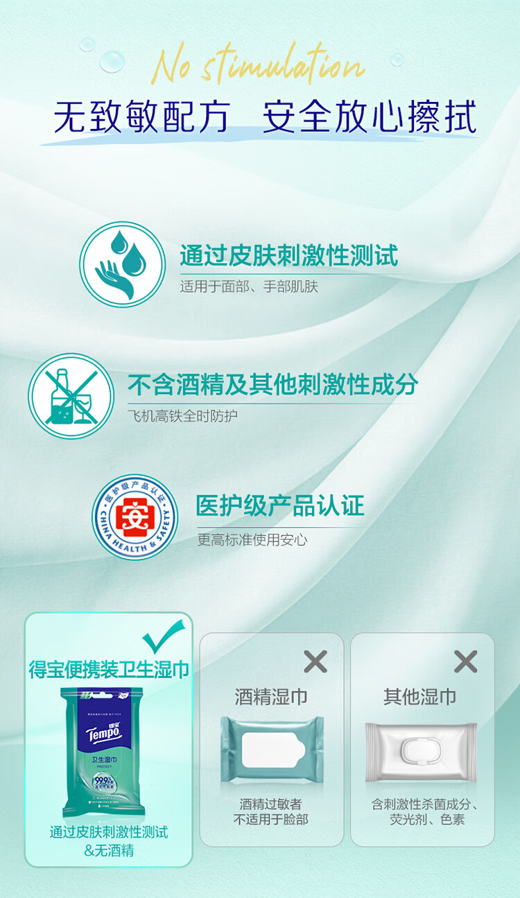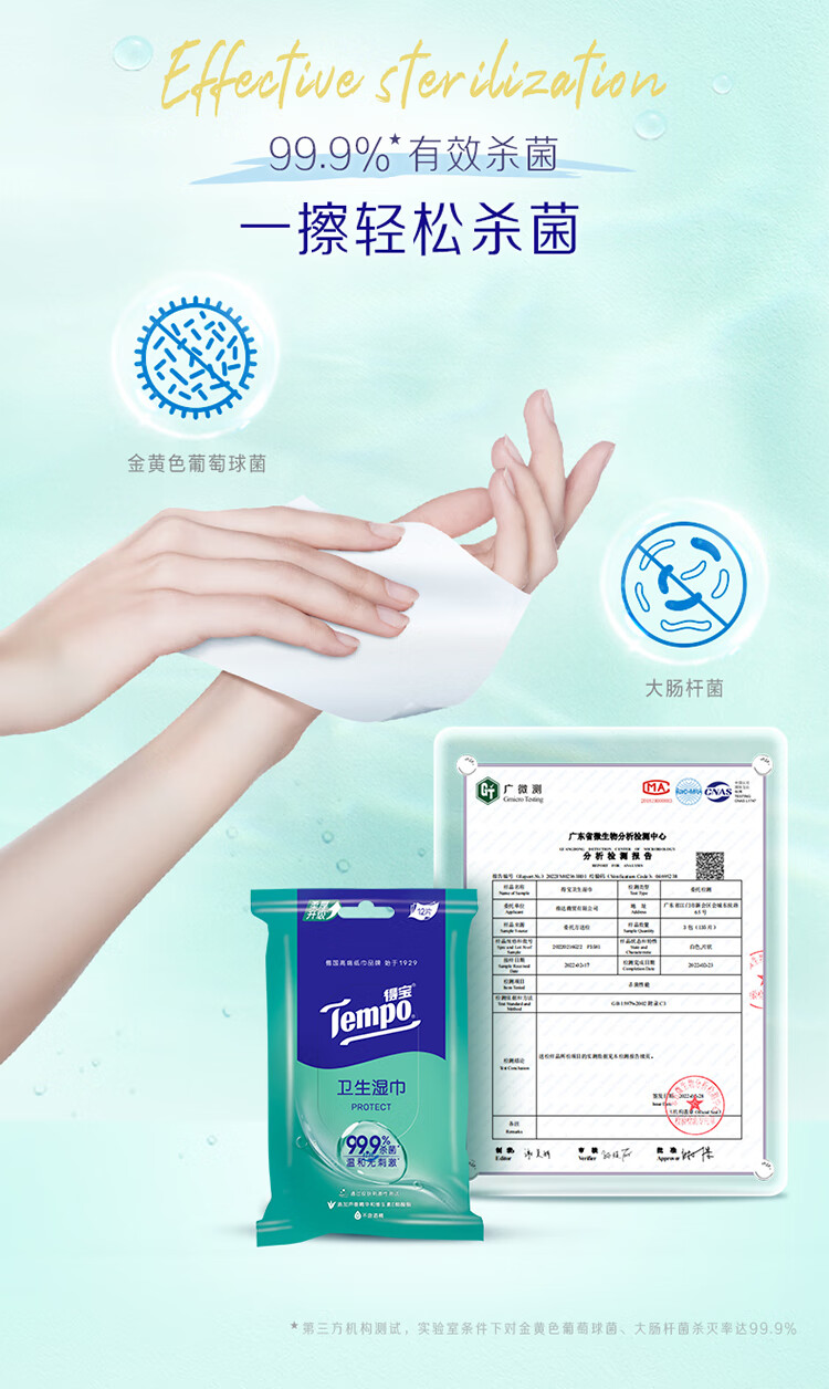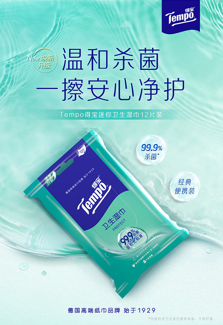 • 商品名称:得宝/TEMPO T3002-1 防护湿巾 一博同款 杀菌湿巾12片*5包 便携装 湿巾小包 高效杀菌 防护湿巾 杀菌湿巾12片*5包