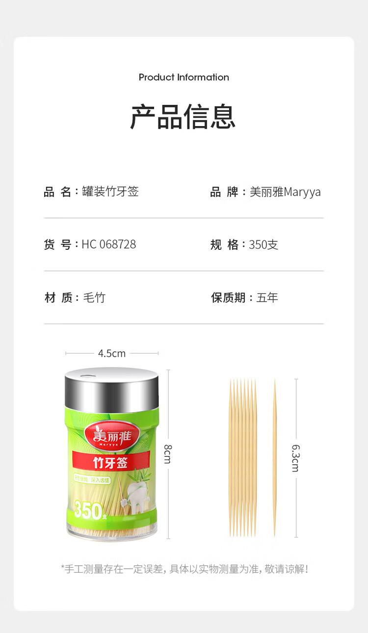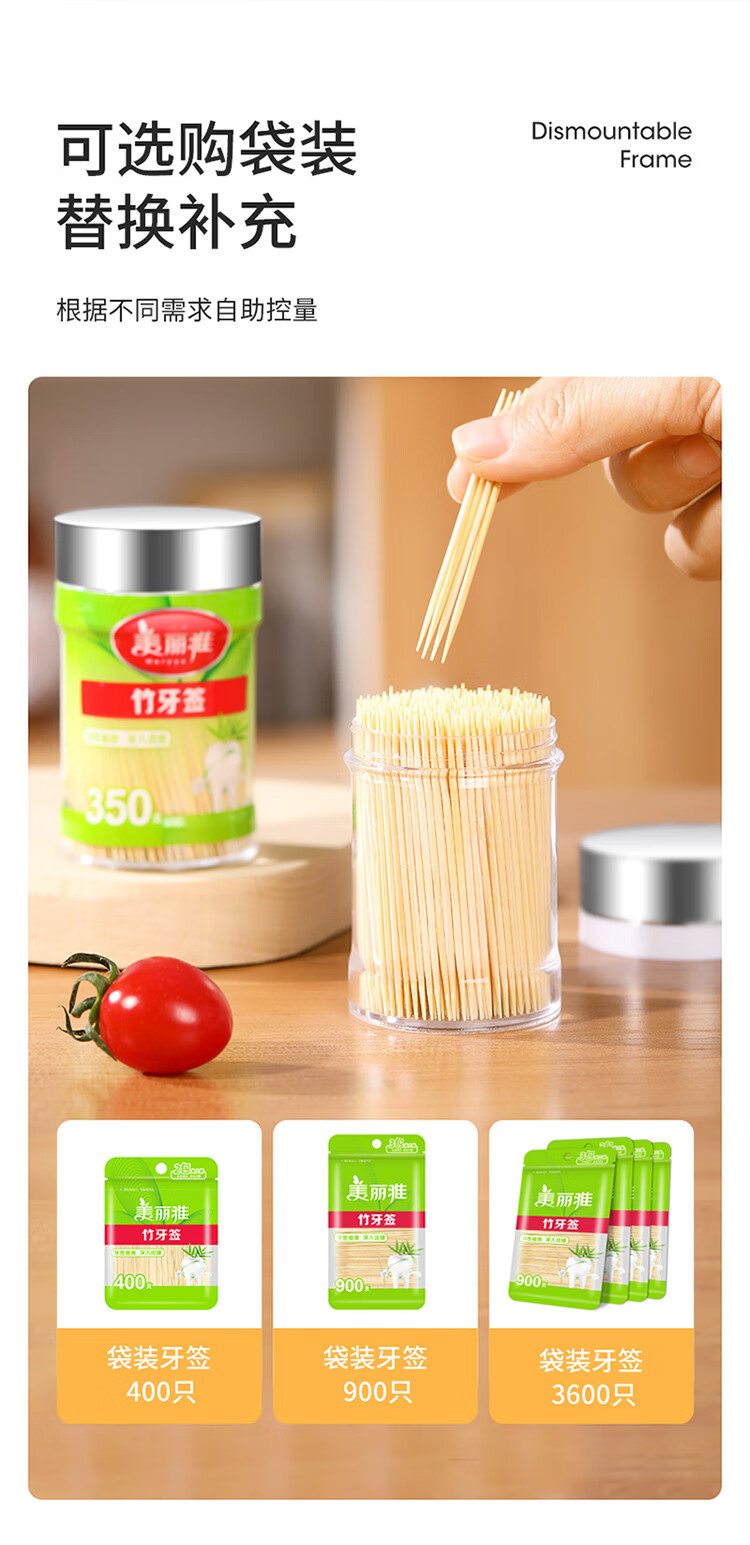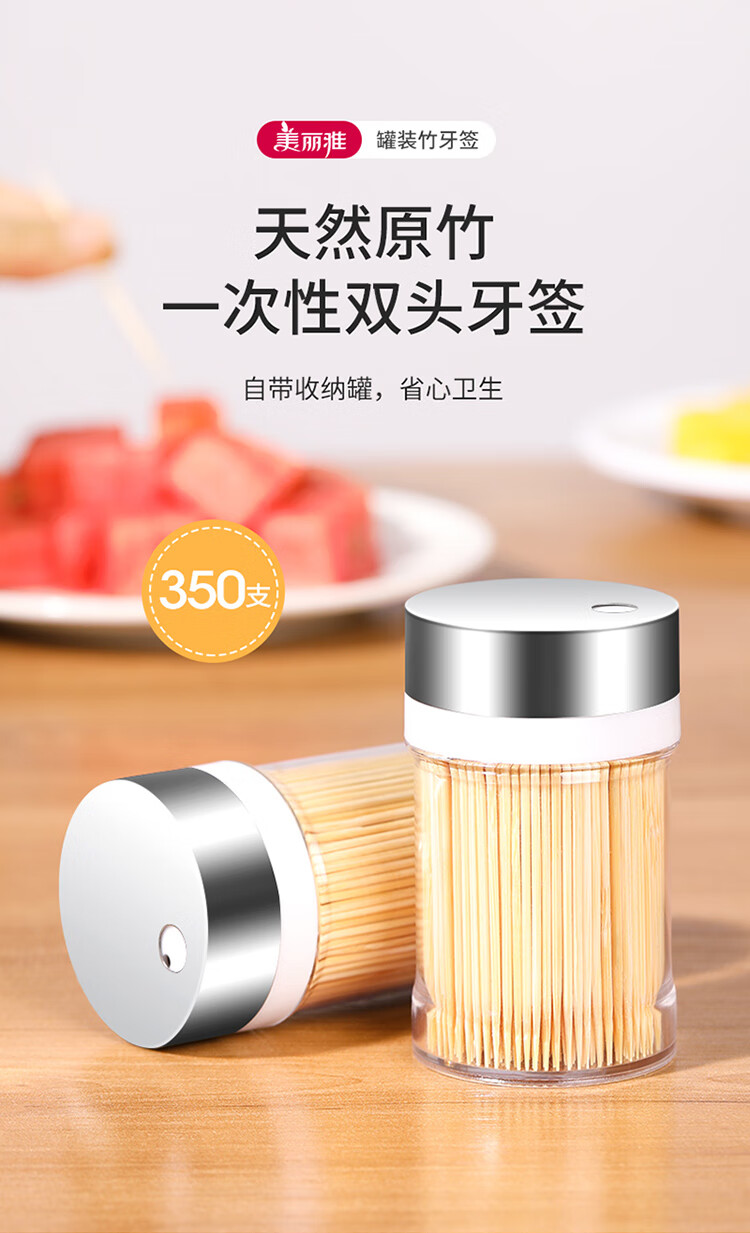 • 商品名称:美丽雅 竹牙签350支 雅竹牙签350支罐装 一次性家用水果牙签盒双头使用剔牙棒餐厅牙签筒 350支罐装