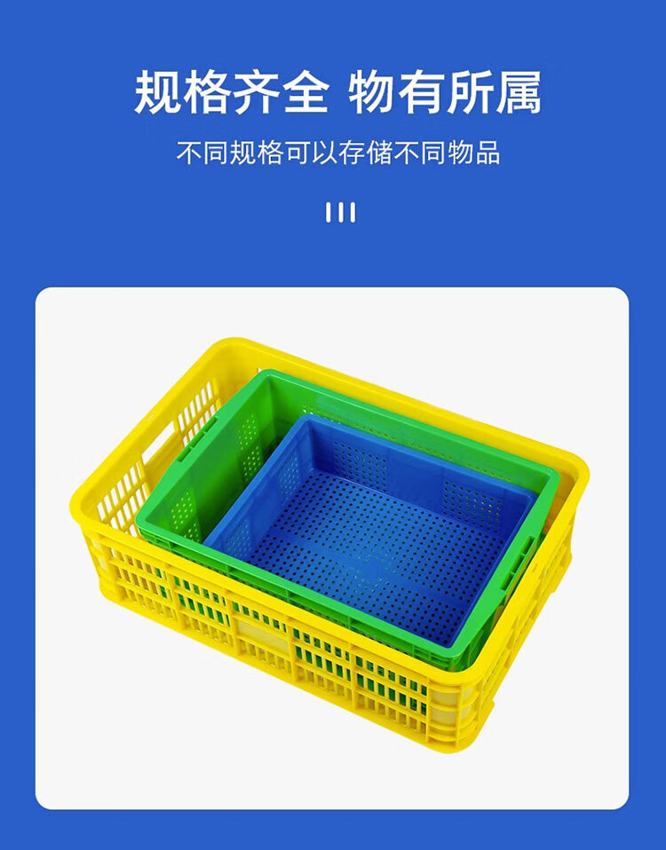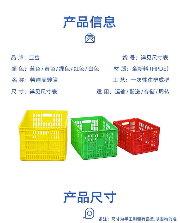 • 商品名称:亚岳 YKZ-25 塑料筐周转筐加厚镂空收纳框 长方形水果蔬菜快递物流筐子畜牧工业胶框杂物篮圆眼孔 380*305*115