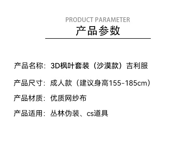 • 商品名称:京家 套装 沙漠款 京家吉利服 伪装衣野战伪装服伪装训练 丛林服3D枫叶套装(沙漠款) 均码