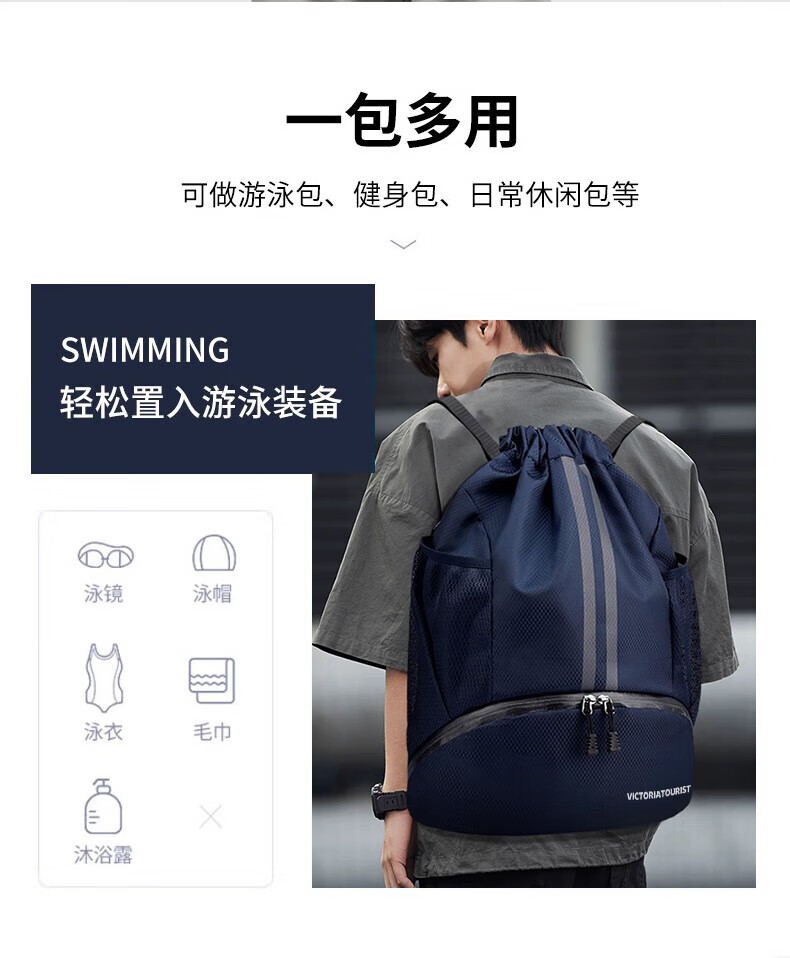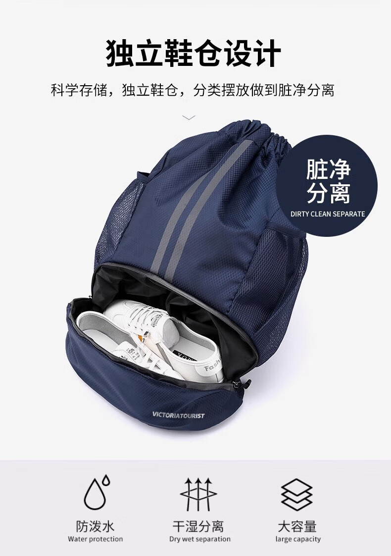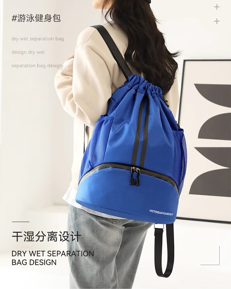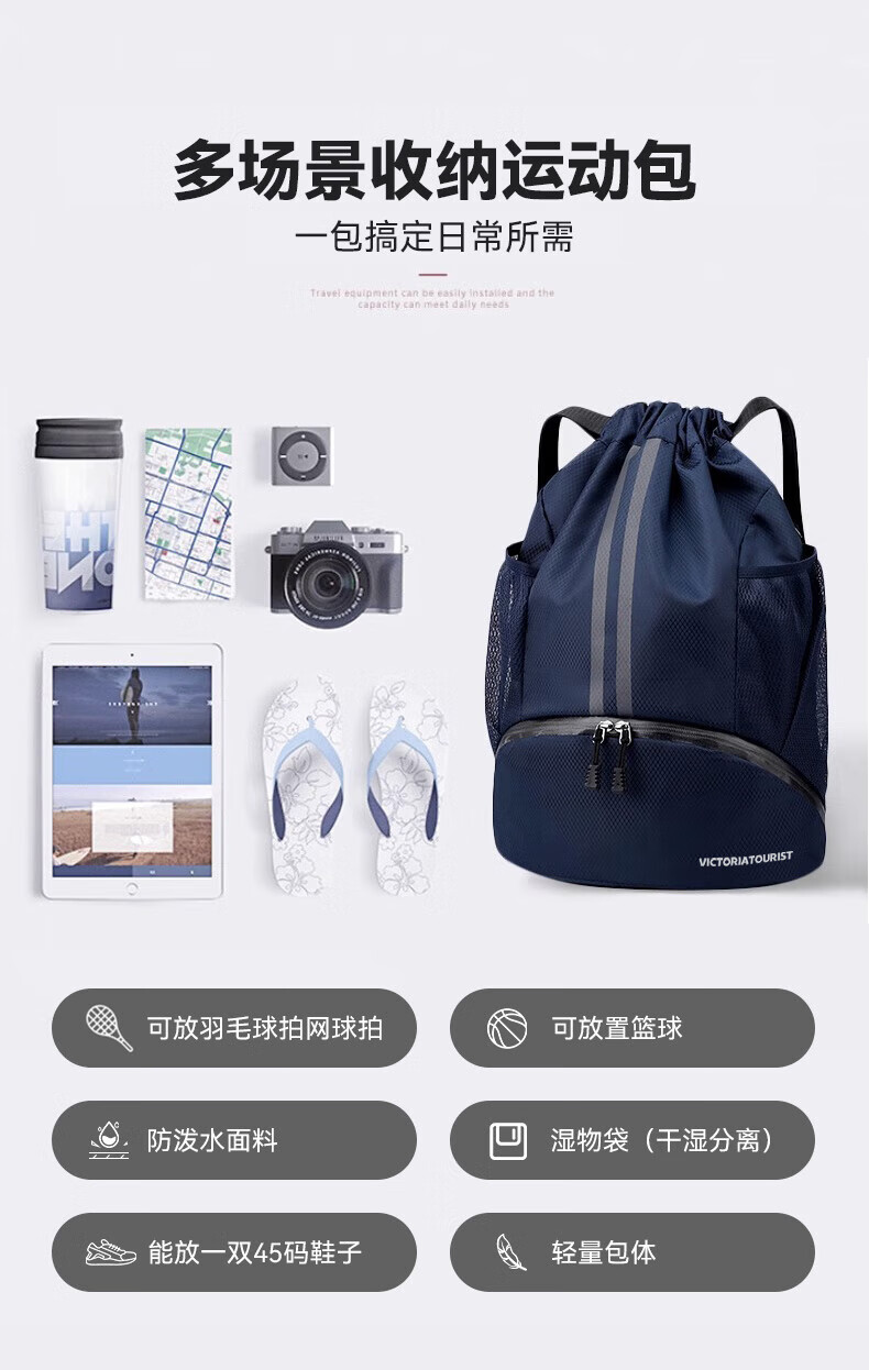 • 商品名称:VICTORIATOURIST 货号:W903-01 VICTORIATOURIST运动包男干湿分离游泳包篮球包背包训练健身束口抽绳双肩背包蓝色 货号:W903-01
