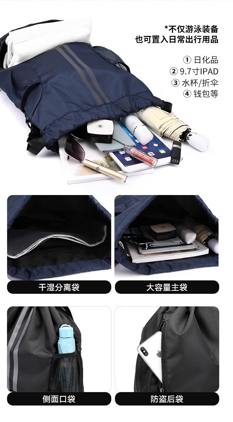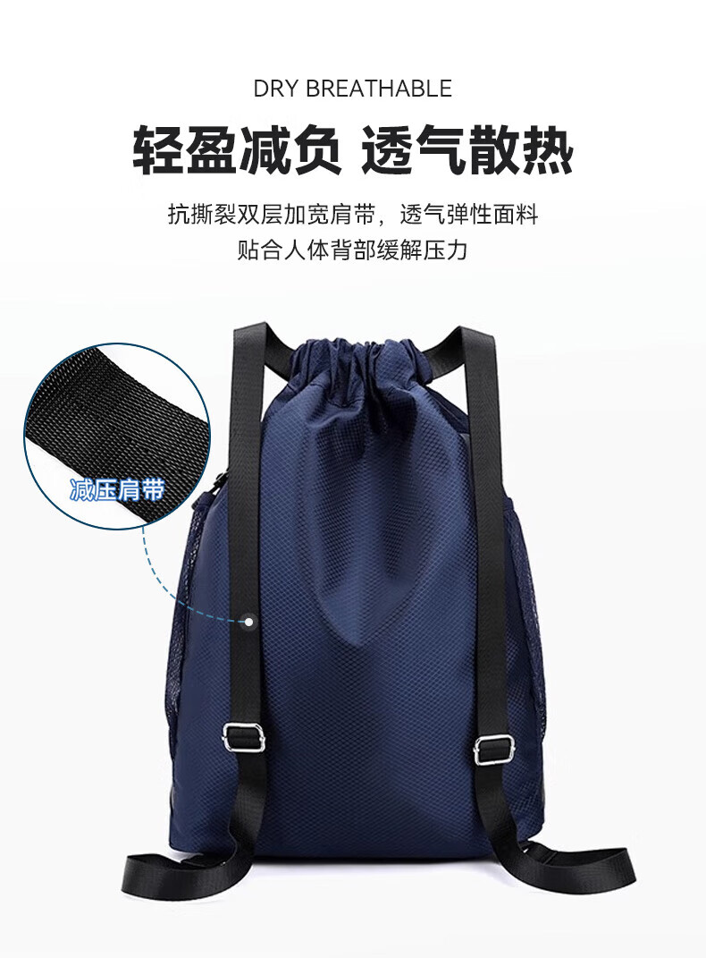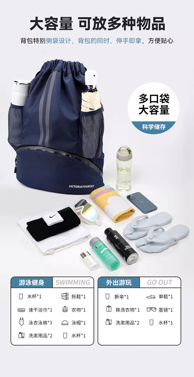 • 商品名称:VICTORIATOURIST 货号:W903-01 VICTORIATOURIST运动包男干湿分离游泳包篮球包背包训练健身束口抽绳双肩背包蓝色 货号:W903-01