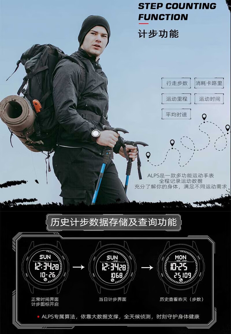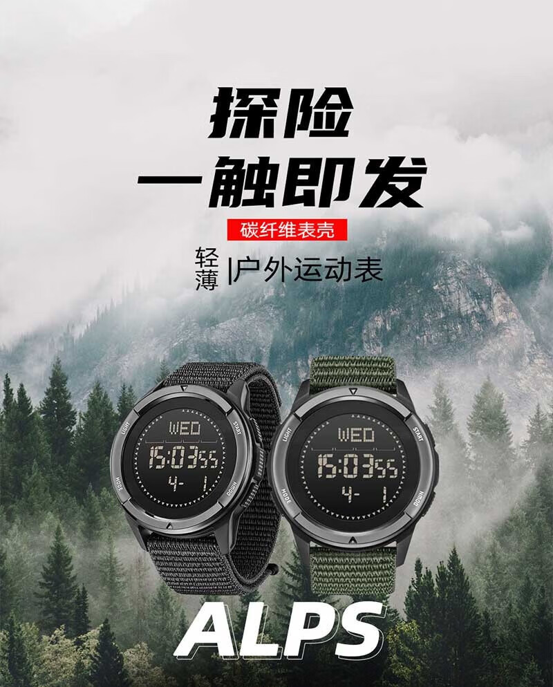 运动户外  > 户外仪表  > 秒表/点数器  >  NORTH EDGE  >  NORTH EDGE ALPS NORTH EDGE碳纤维电子手表男士轻便指南针计步秒表节拍器腕表 ALPS【黑色】 ALPS