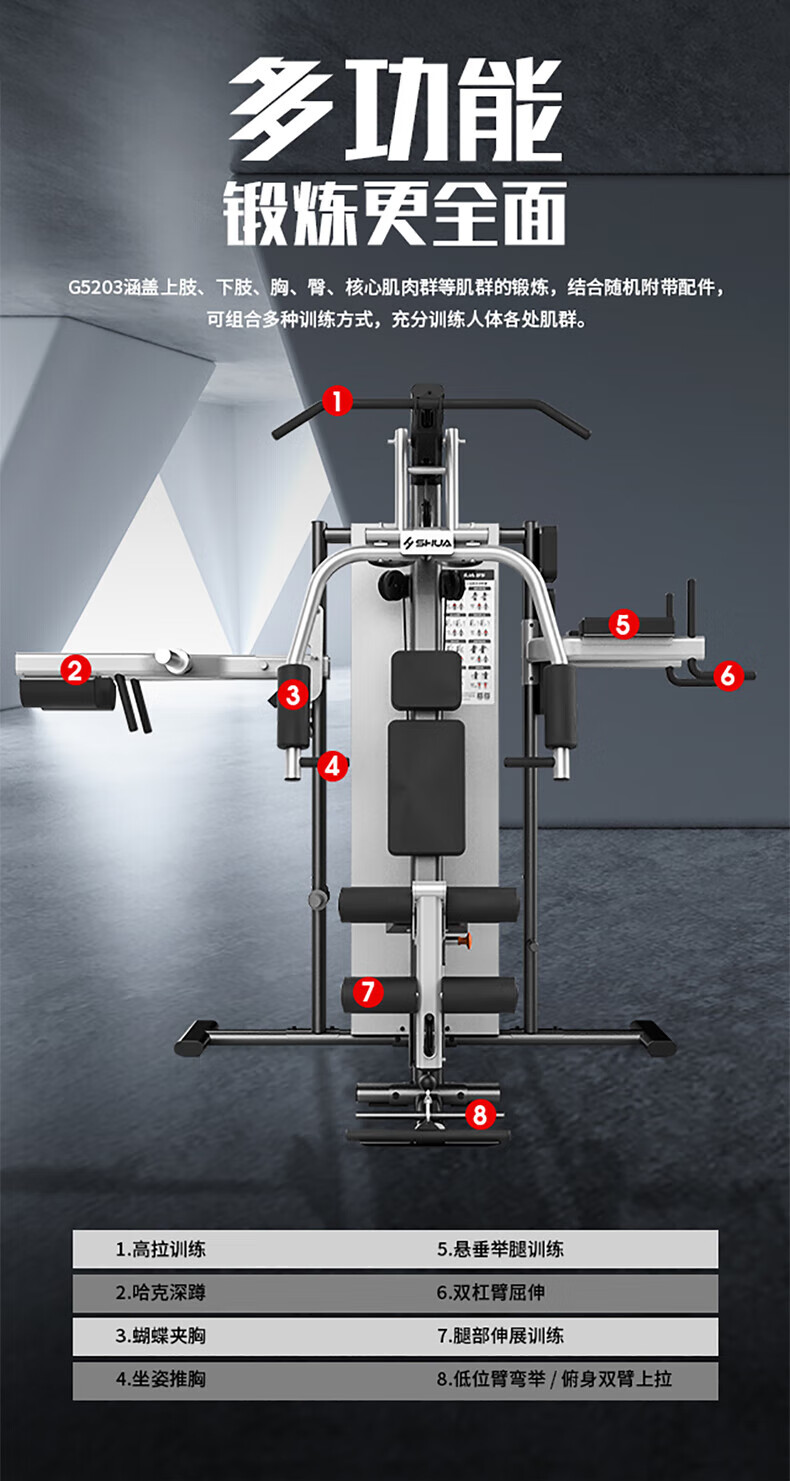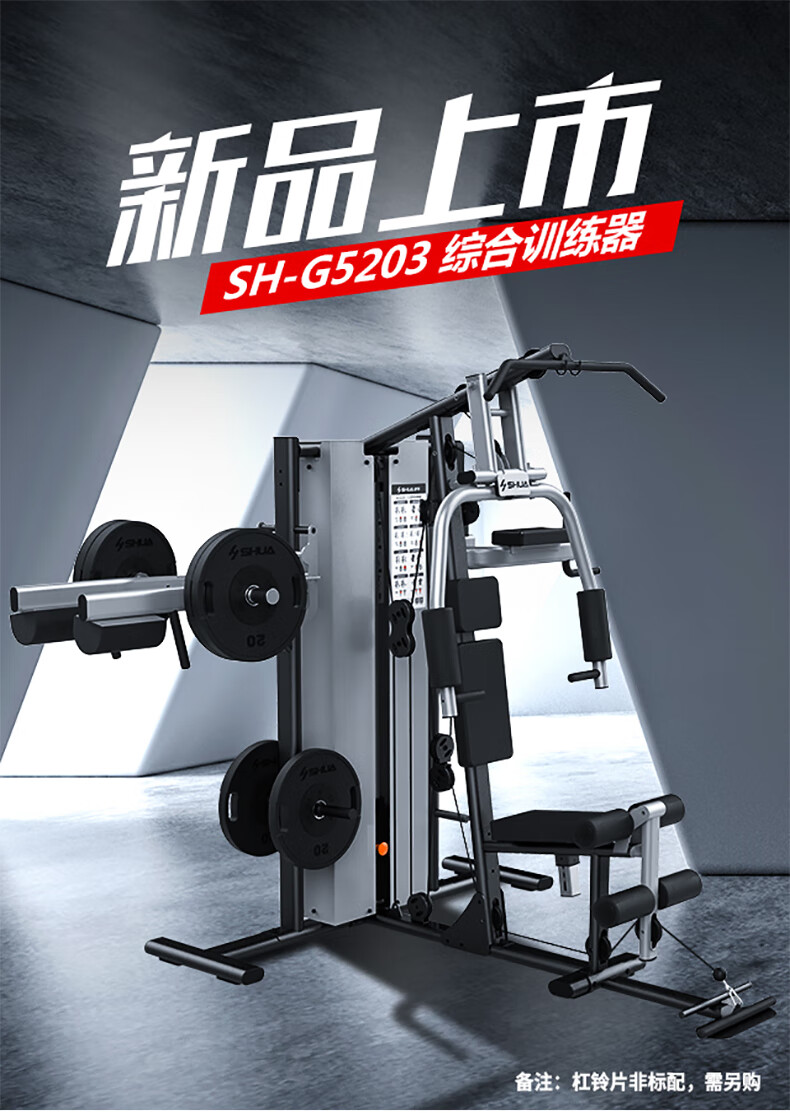 商品名称: 舒华/SHUA SH-G5203 舒华(SHUA)SH-G5203综合训练器多功能三人力量站【配套5-10kg杠铃片】 SH-G5203