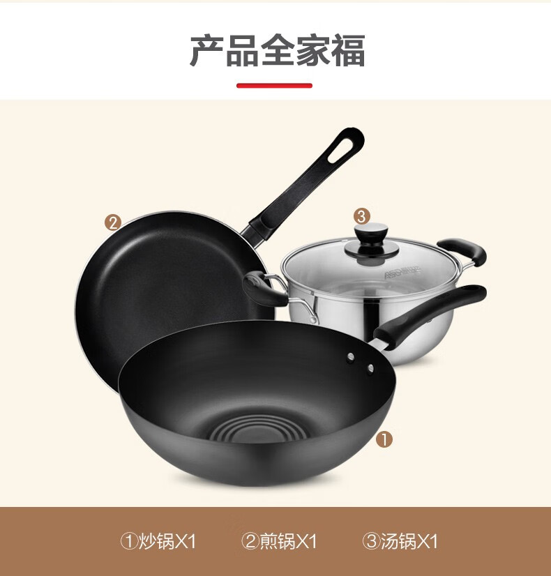 厨具  > 烹饪锅具  > 炒锅  >  爱仕达/ASD  >  爱仕达/ASD PH03B2TG 爱仕达(ASD) 聚味锅具套装精铁无涂层不粘煎锅三件套 炒锅30cm +煎锅26cm +汤锅20cm明火适用 PH03B2TG PH03B2TG