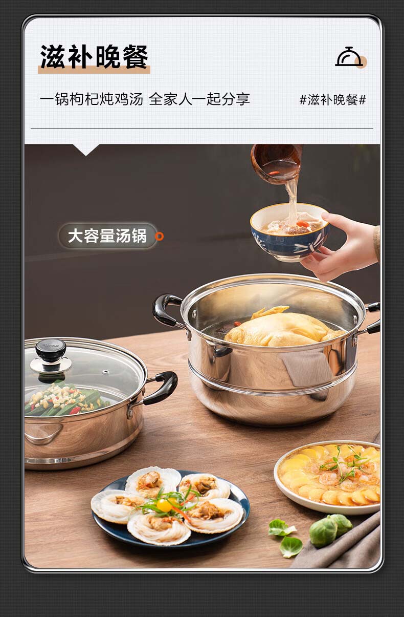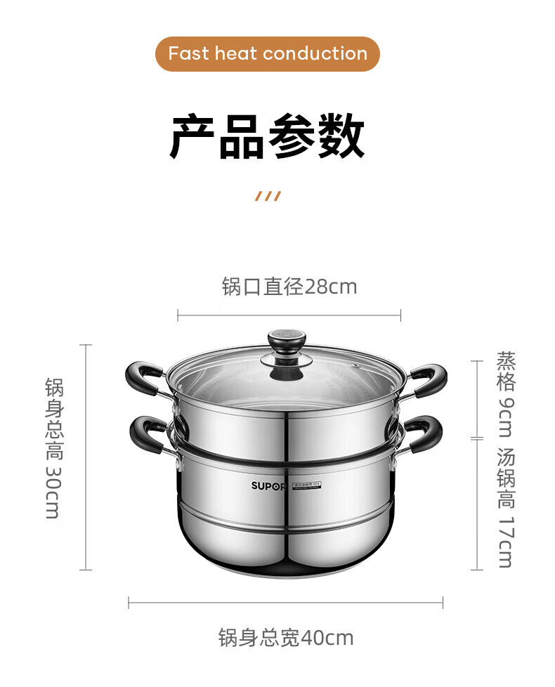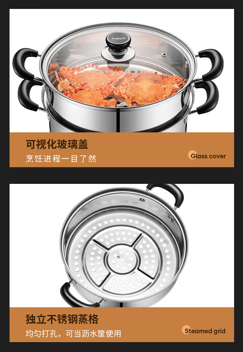 • 商品名称:苏泊尔/SUPOR SZ26B5 苏泊尔(SUPOR)304不锈钢蒸锅26cm双层复底汤锅二层蒸笼电磁炉锅具SZ26B5 SZ26B5