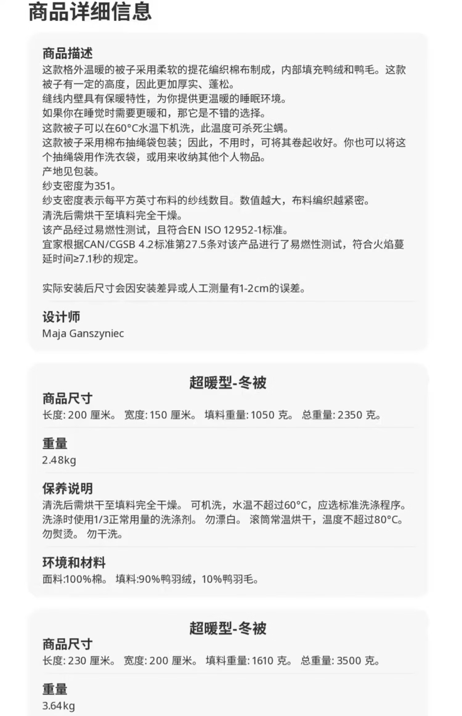 商品名称: 宜家/IKEA 菲亚哈 宜家IKEA 菲亚哈羽绒被家用白鸭绒保暖被子春夏被冬被被芯 菲亚哈
