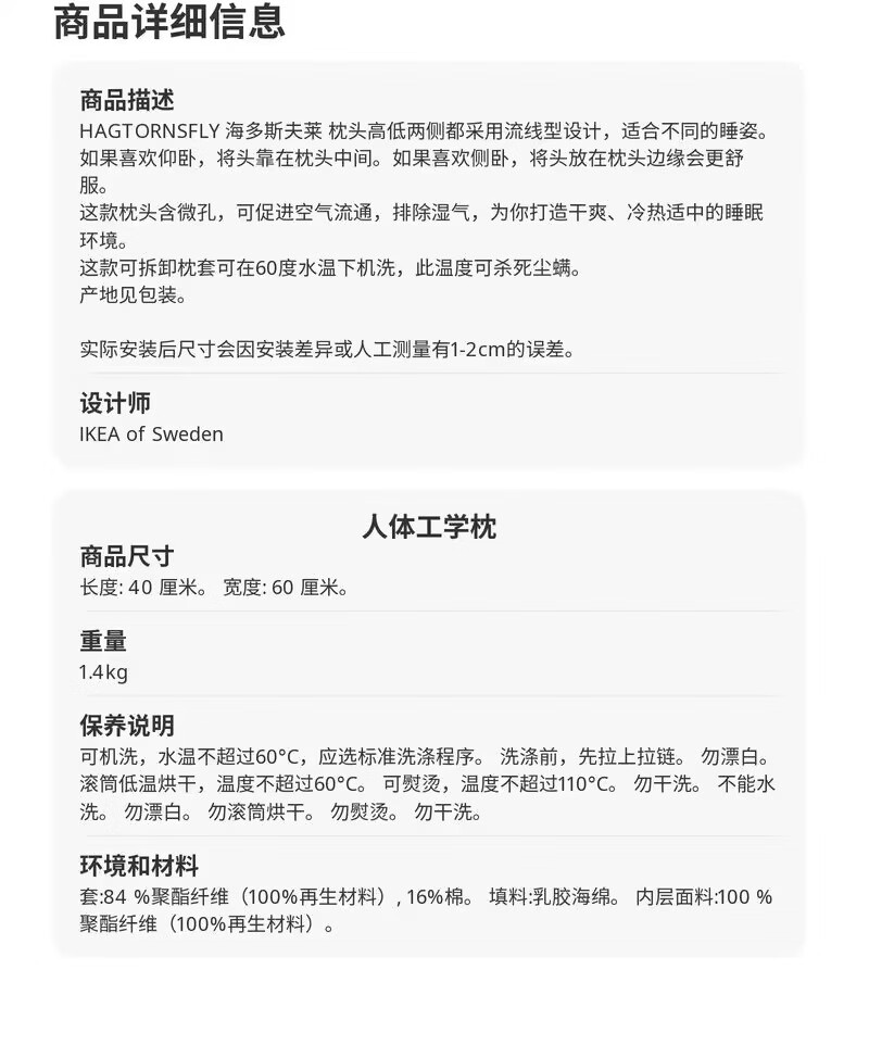 • 商品名称:宜家/IKEA 海多斯夫莱 宜家IKEA 海多斯夫莱家用枕头人体工学枕芯护颈椎助睡眠乳胶枕 海多斯夫莱