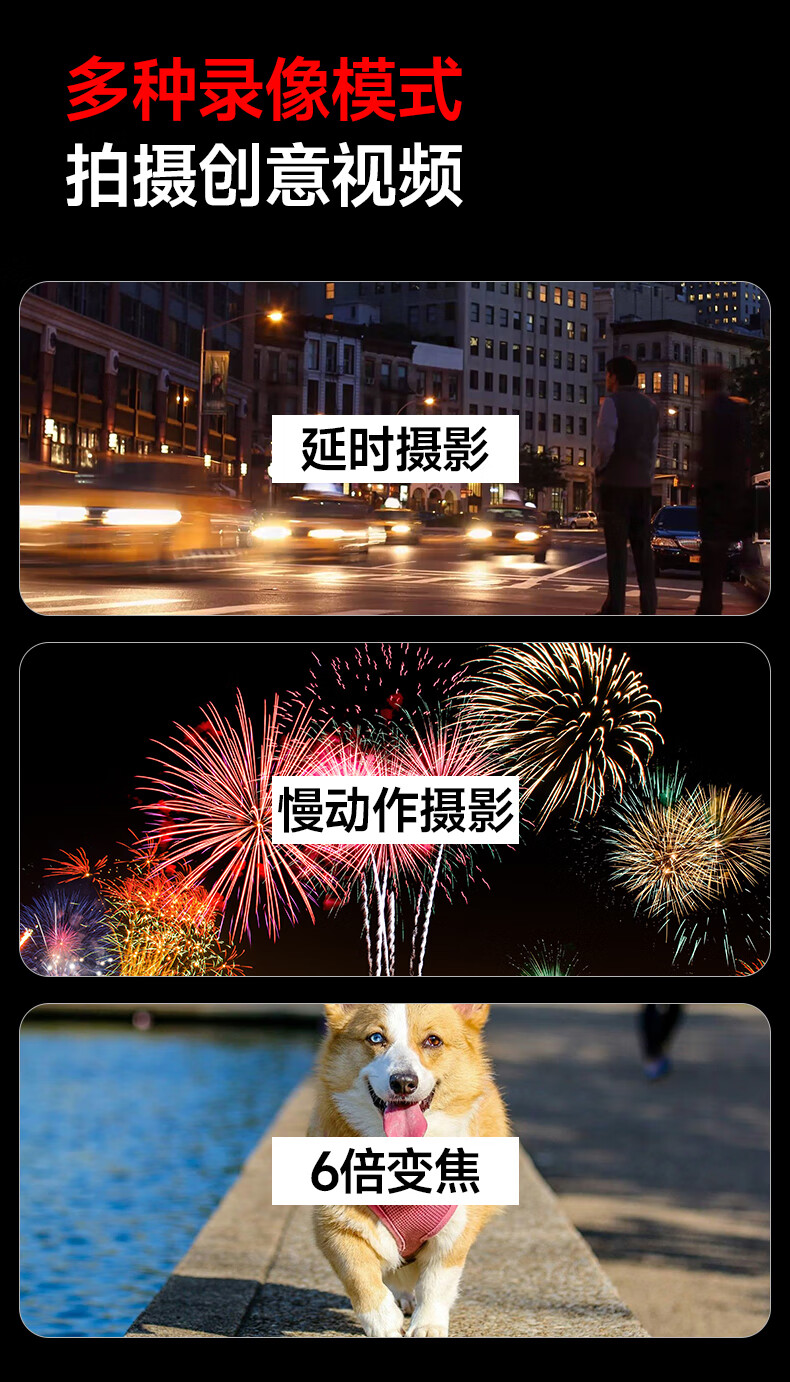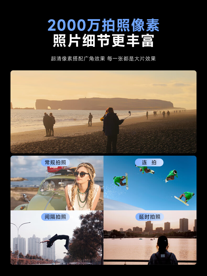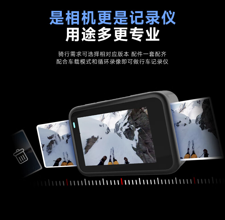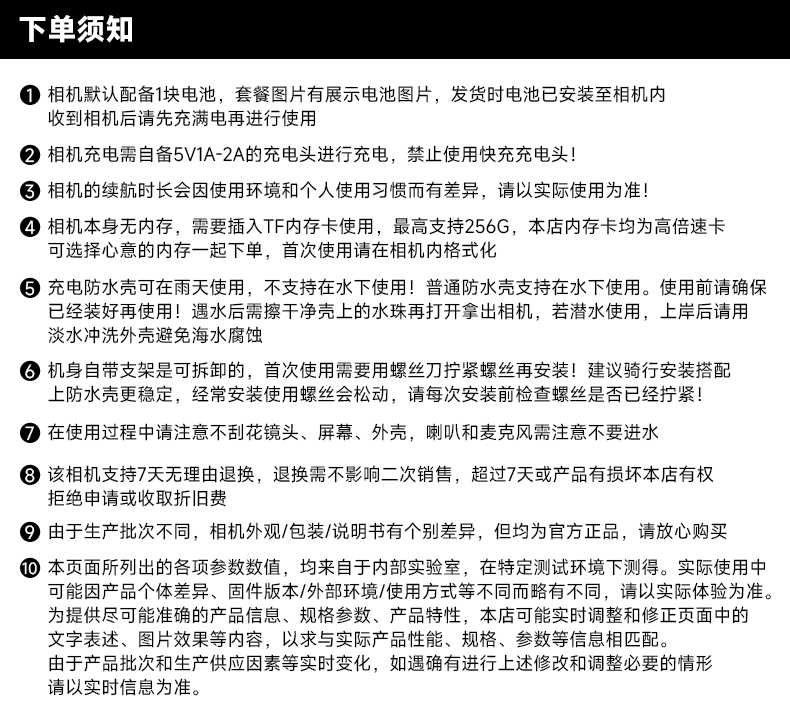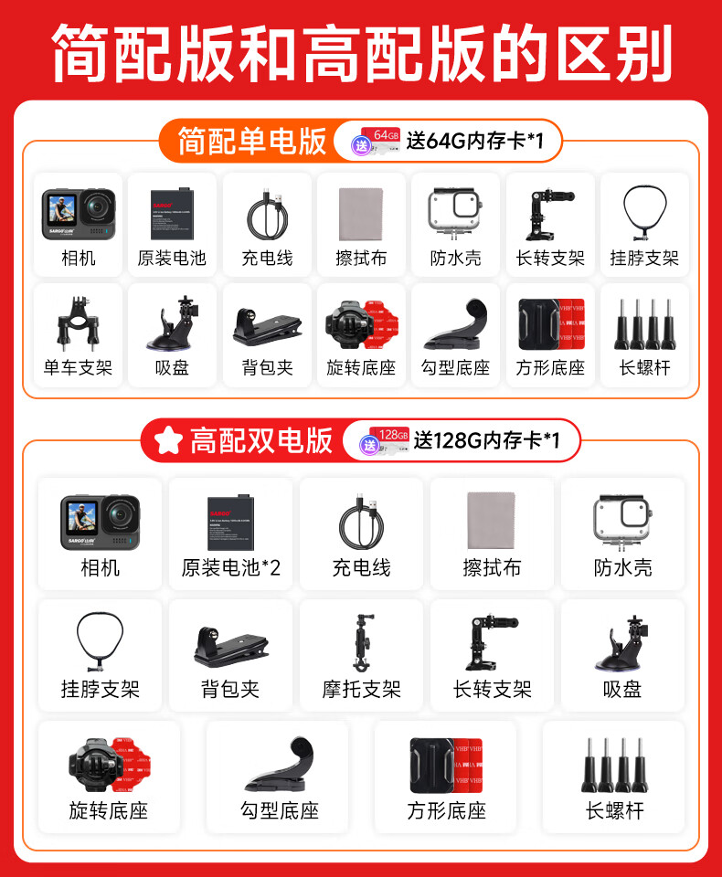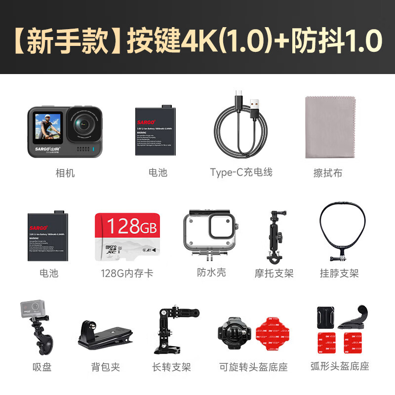 包装清单: 机器*1、电池*2、USB数据线*1、擦拭布*1、吸盘*1、背包夹*1、挂脖支架*1、摩托支架*1、防水壳*1、头盔底座(弧)*1、360底座*1、长转支架*1、高倍数专用128G内存卡*1