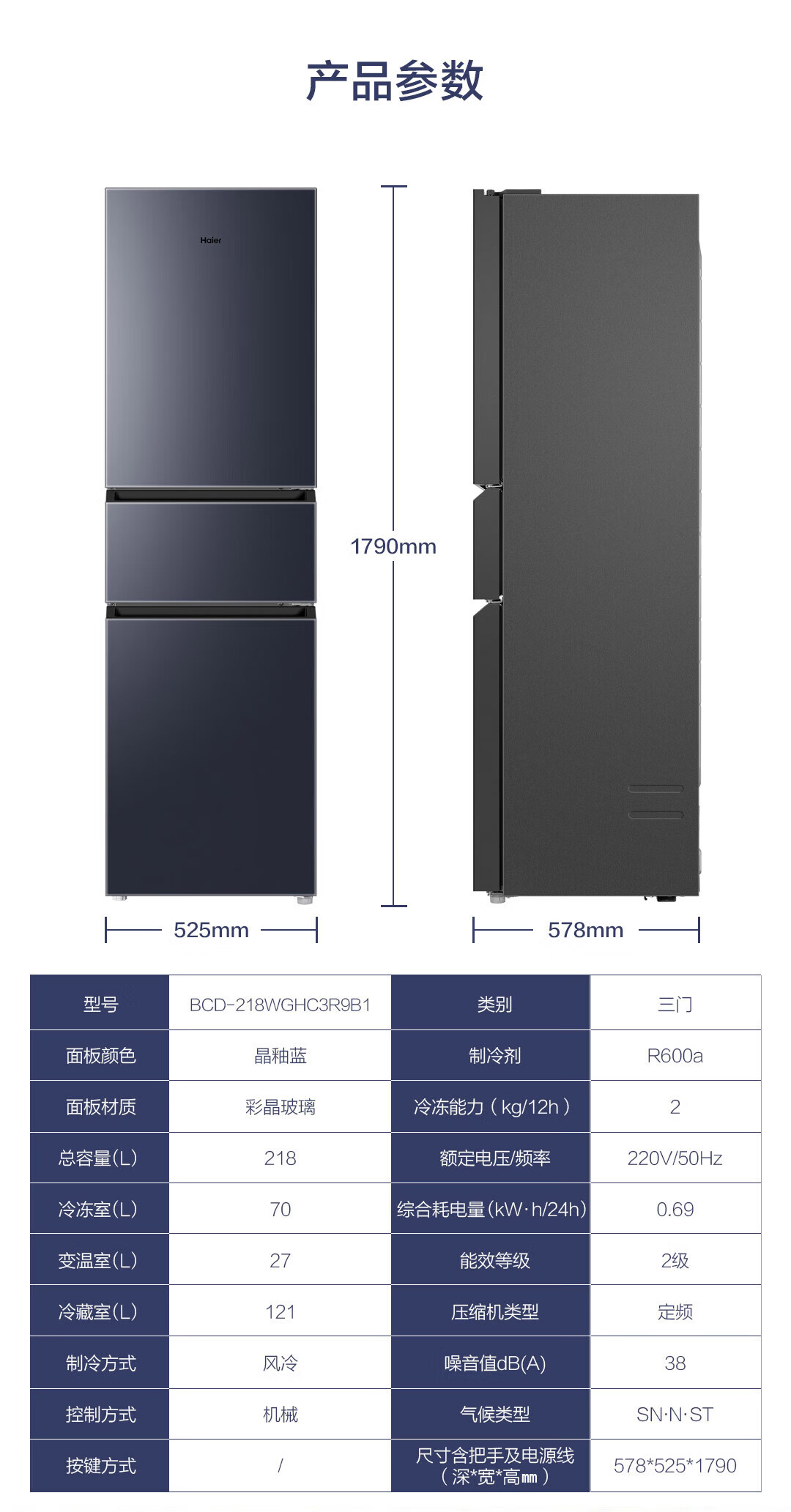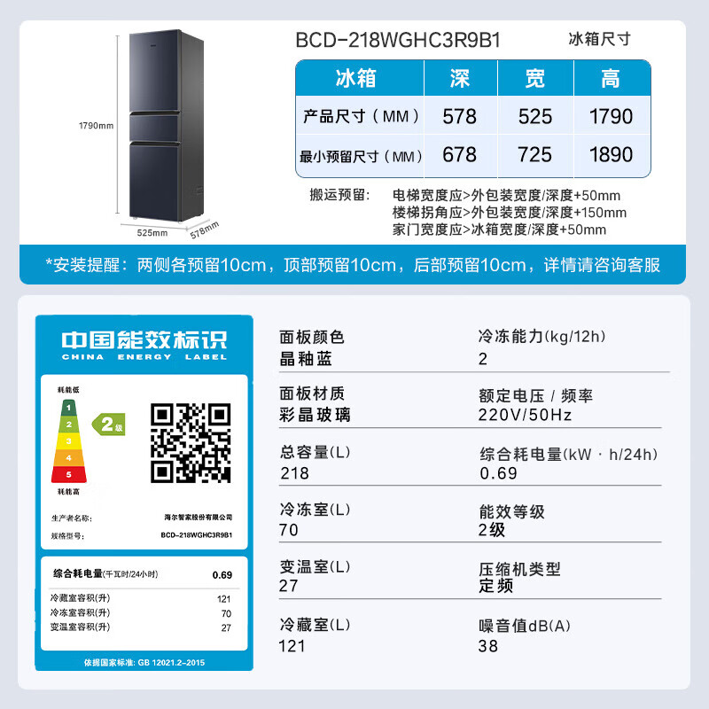 • 商品名称:海尔(Haier)218升彩晶玻璃三门风冷无霜变温大冷冻电冰箱BCD-218WGHC3R9B1 BCD-218WGHC3R9B1/台