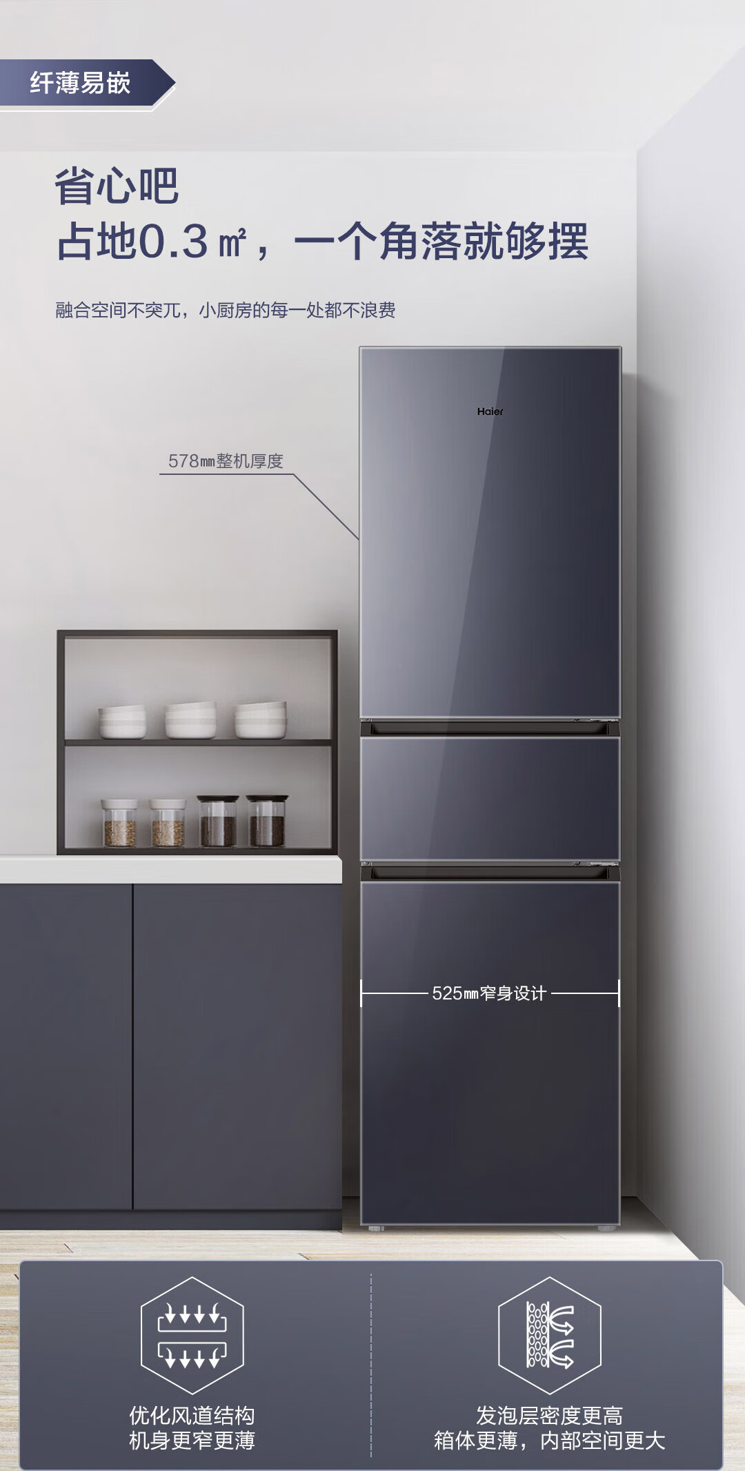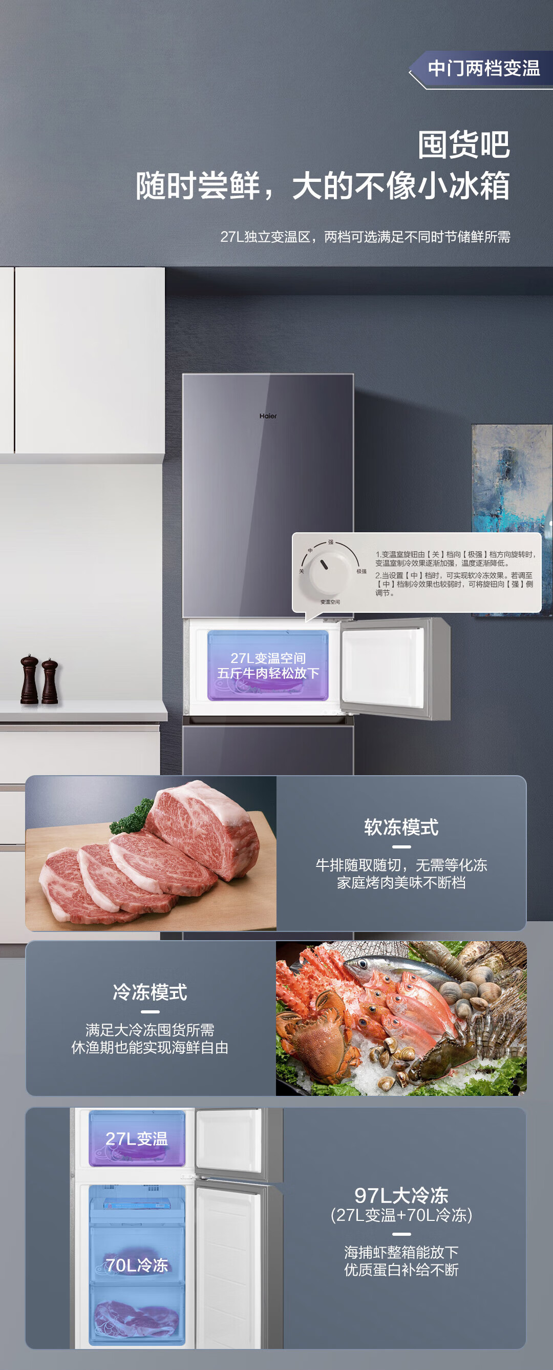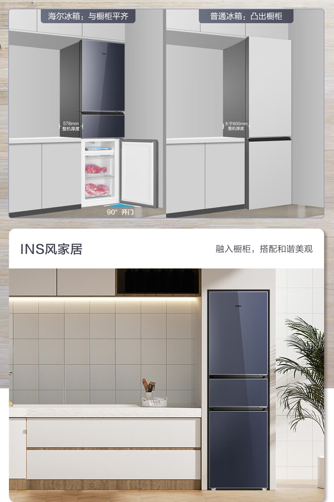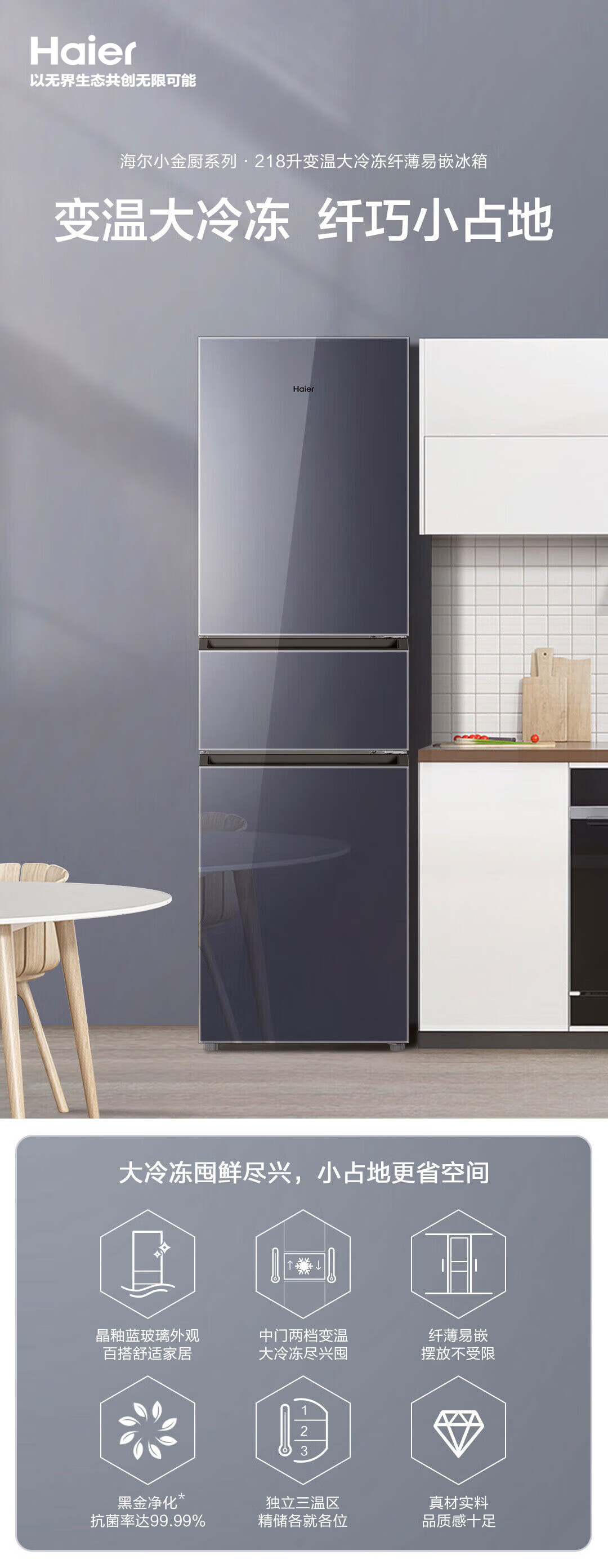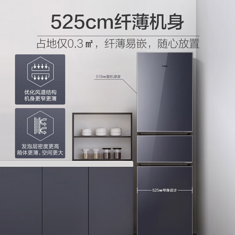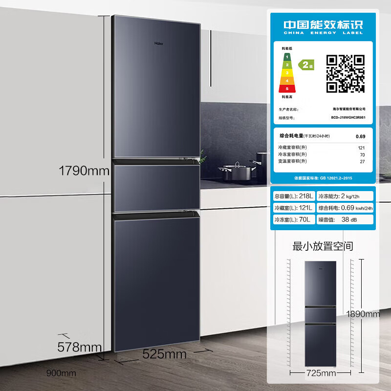 海尔(Haier)218升彩晶玻璃三门风冷无霜变温大冷冻电冰箱BCD-218WGHC3R9B1 BCD-218WGHC3R9B1/台