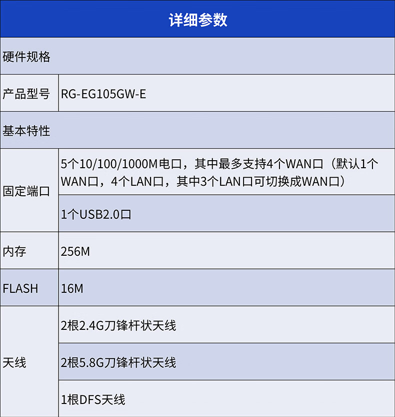 • 商品名称:锐捷(Ruijie)千兆WiFi6企业级无线网关路由器 RG-EG105GW-E 双频1800M 多WAN口 无线AC控制器 RG-EG105GW-E/台