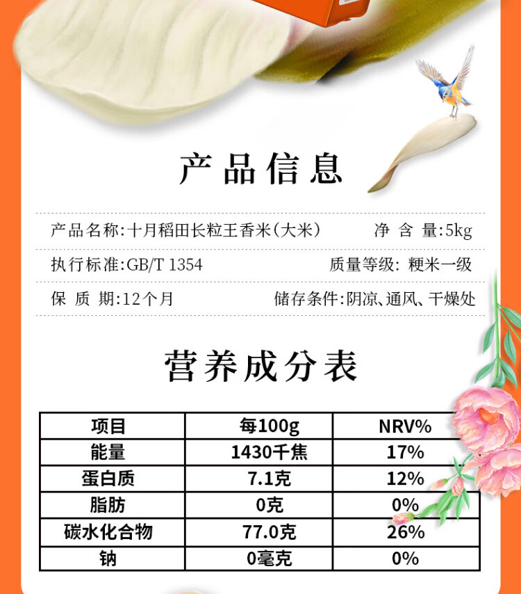 包装清单: 十月稻田 长粒王香米5kgX1袋