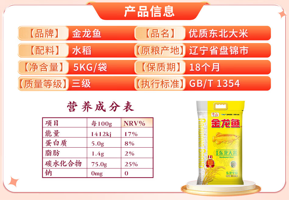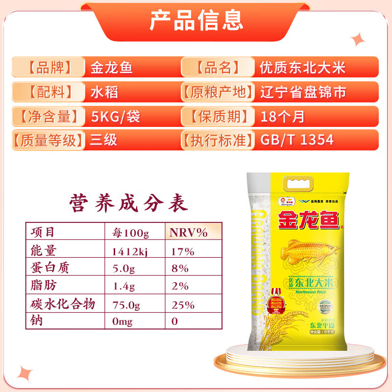 • 商品名称:金龙鱼 优质东北大米 5kg 粳米 大米十斤 金龙鱼/袋
