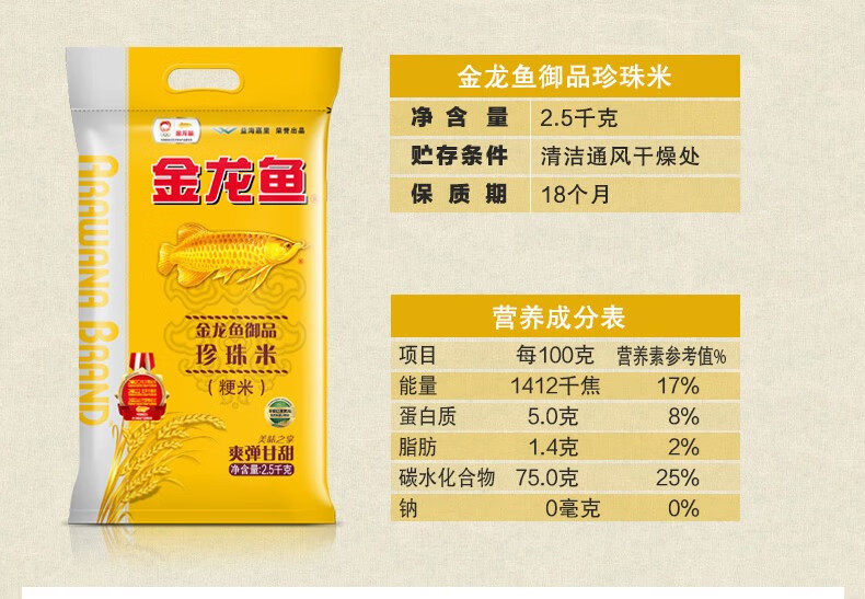 商品名称: 金龙鱼 御品珍珠米 煮粥蒸米饭专用大米 2.5kg/袋 珍珠米/袋