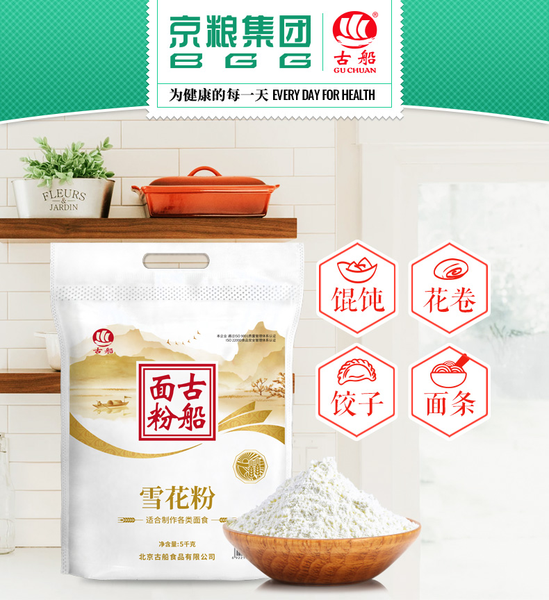 • 商品名称:古船面粉雪花粉10斤麦芯面粉 中筋 小麦粉包子面条馒头披萨粉家用白面 雪花粉/袋