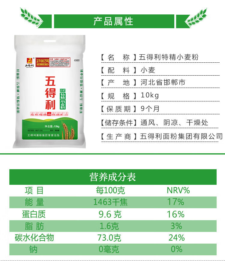 包装清单: 五得利 特精小麦粉10kg*1