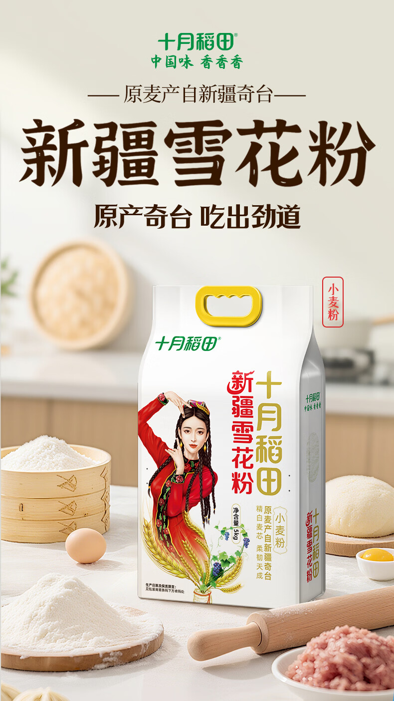 粮油调味  > 面粉/面条  > 通用粉  >  十月稻田/SHIYUEDAOTIAN  >  十月稻田 新疆奇台面粉10斤 新疆面粉无添加 白面 中筋小麦粉 饺子粉 十月稻田 新疆雪花面粉5kg/袋