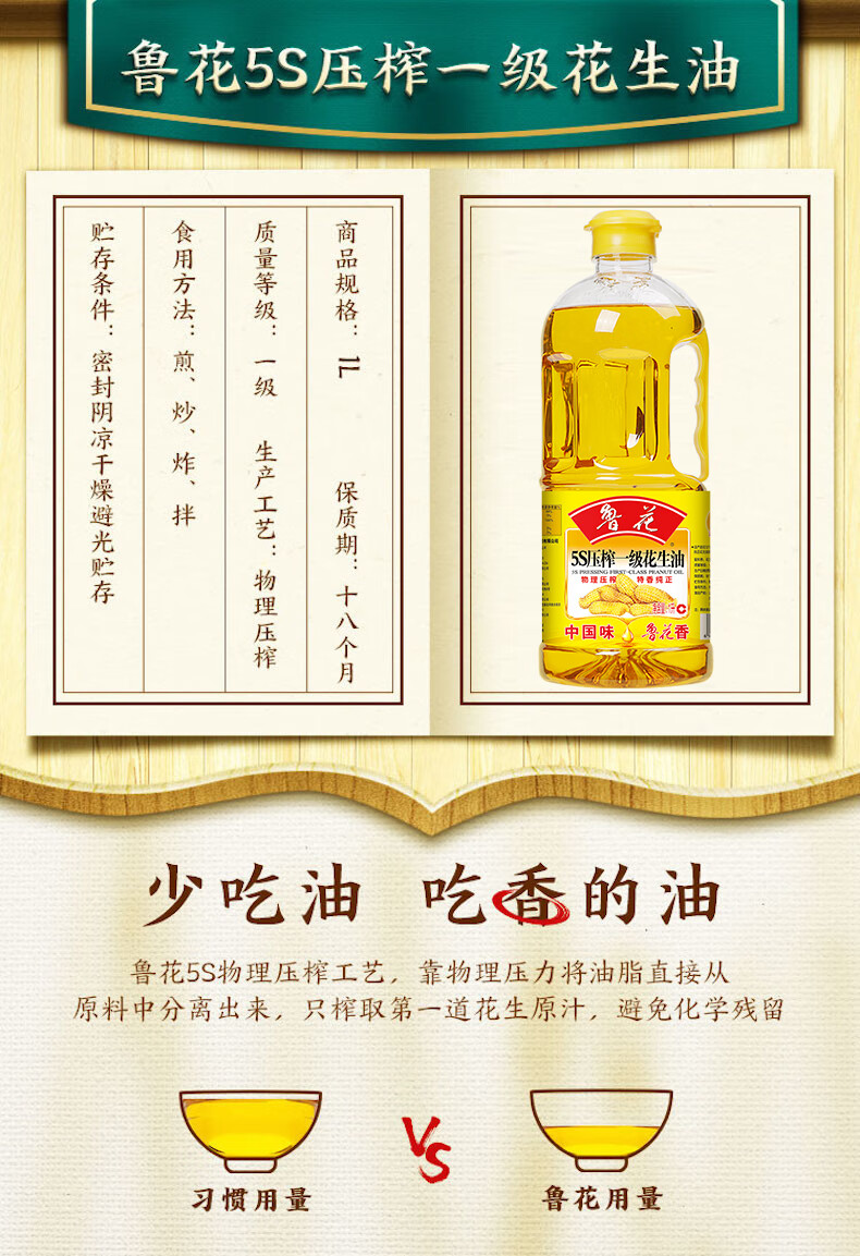 商品名称: 鲁花食用油 5S 物理压榨 压榨一级 花生油1L 花生油/瓶