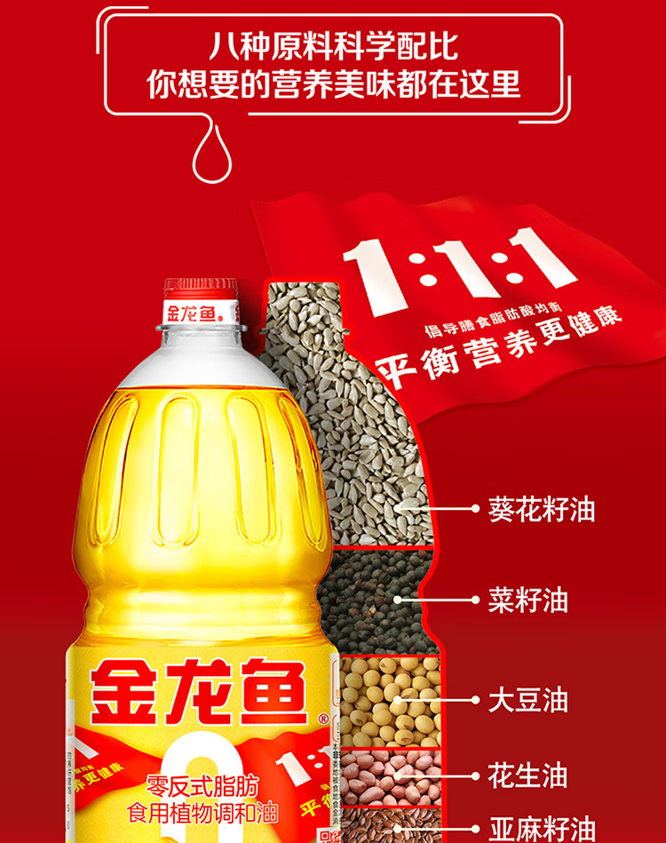食品饮料  > 粮油调味  > 南北干货  >  金龙鱼  >  金龙鱼 黄金比例食用调和油1.8L 零反式脂肪食用植物调和油 调和油/瓶