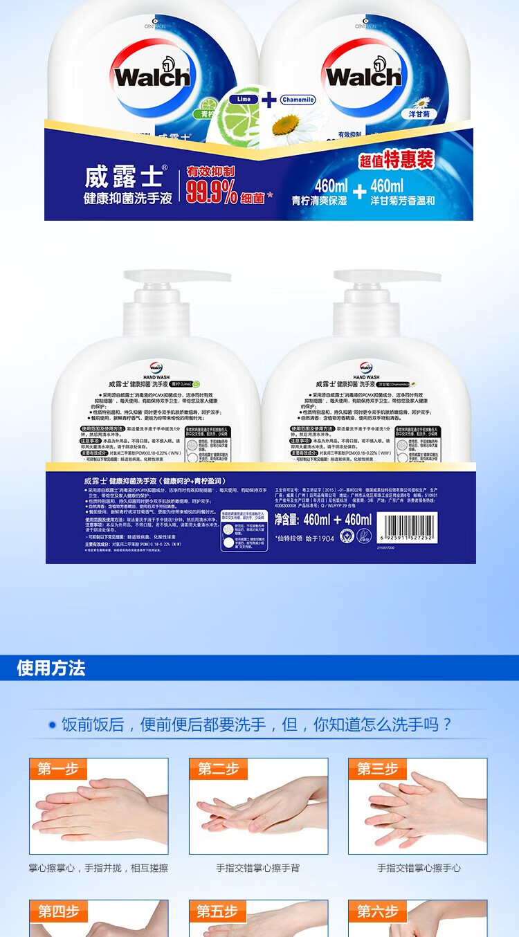 个人护理  > 身体护理  > 洗手液  >  威露士/Walch  >  威露士 洗手液 家庭装 青柠460ml+洋甘菊460ml 920ml/盒