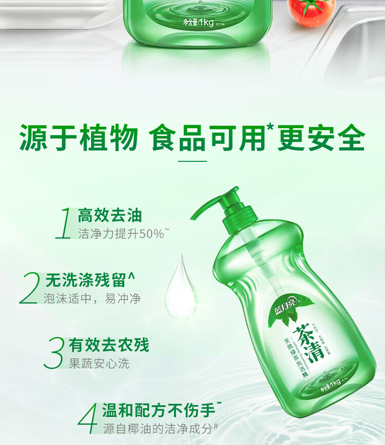 商品名称: 蓝月亮 茶清洗洁精 1kg/瓶 洗涤灵 果蔬餐具清洗剂 食品可用 高效去油 洗洁精1kg/瓶/瓶