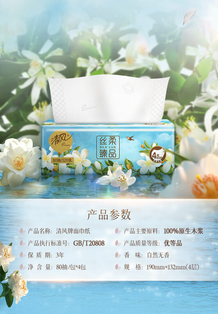 • 商品名称:清风抽纸 花萃4层80抽*4包S码 面巾纸 卫生纸巾 提装BR41SHC(包邮) BR41SHC/提