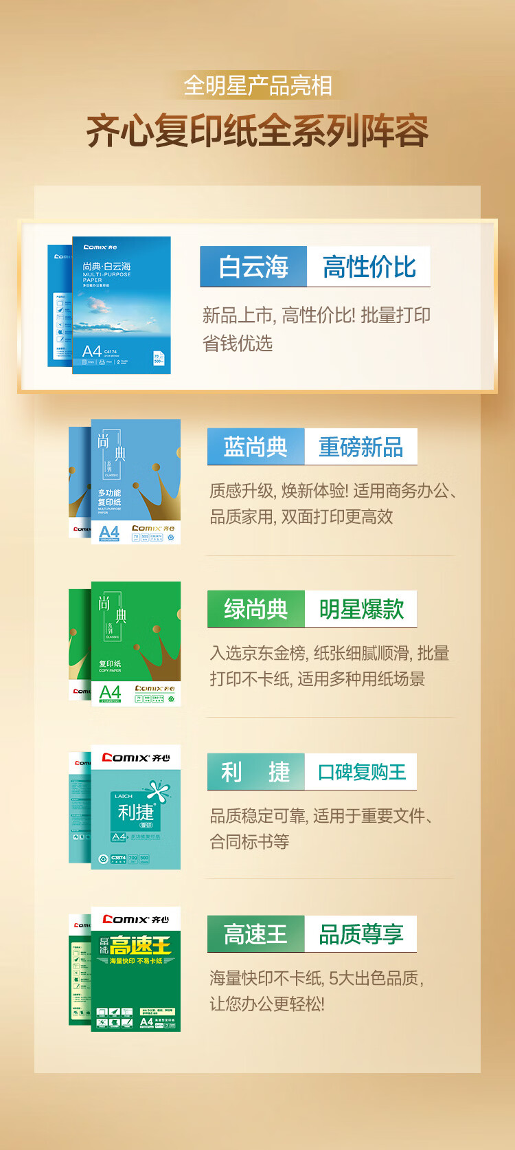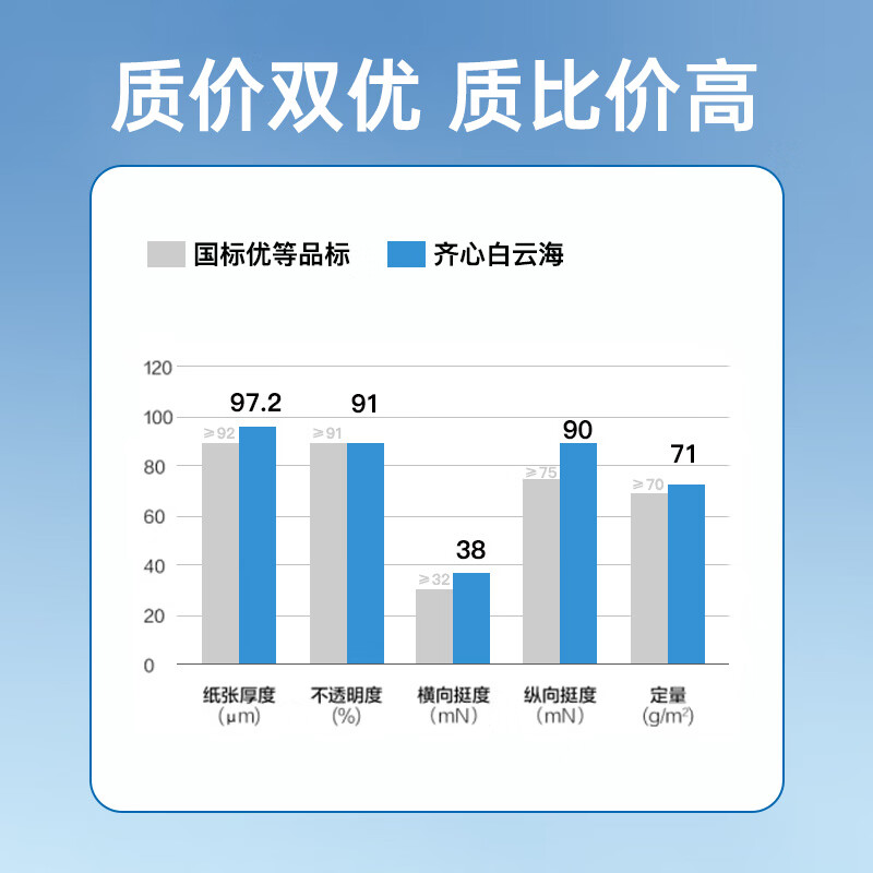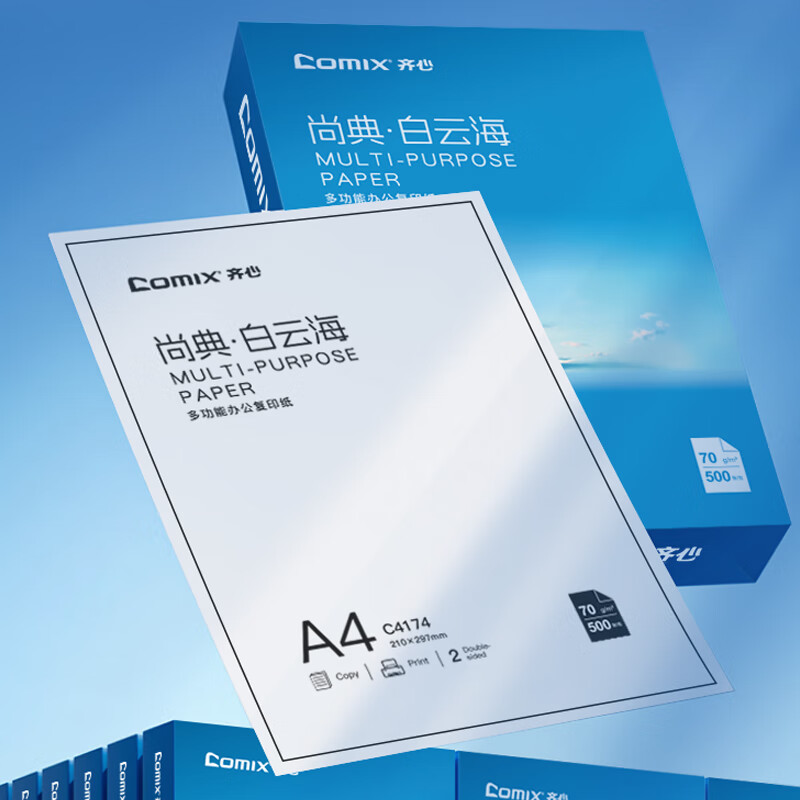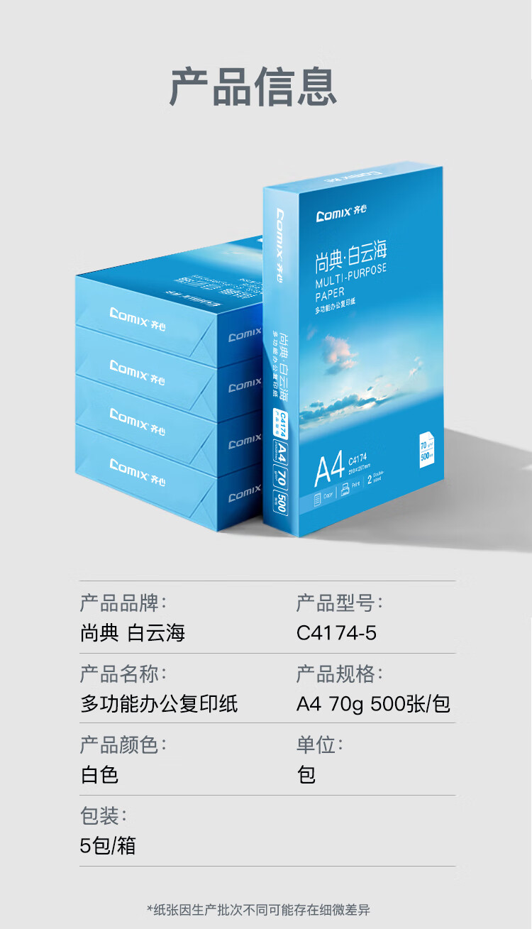 • 商品名称:齐心(COMIX)白云海A4打印纸 70g 500张*5包 双面顺滑畅打a4复印纸 办公商务学生绘画 整箱2500张【人气新品】 C4174-5/箱