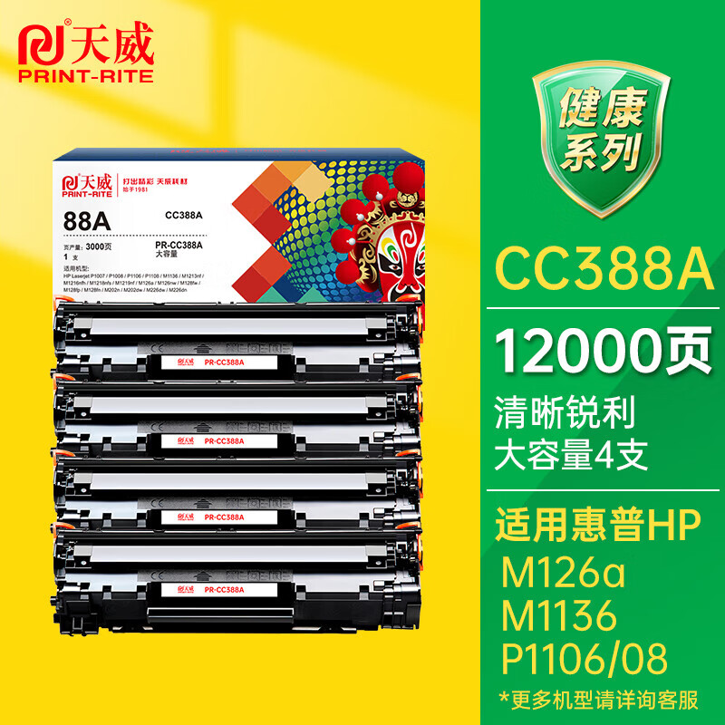电脑、办公  > 办公耗材  > 硒鼓  >  天威/PRINT-RITE  >  天威388a硒鼓88a适用惠普m1136硒鼓 hp1108硒鼓 m126a m128fn p1007打印机p1106墨盒cc388a硒鼓 4支大容量 388/箱