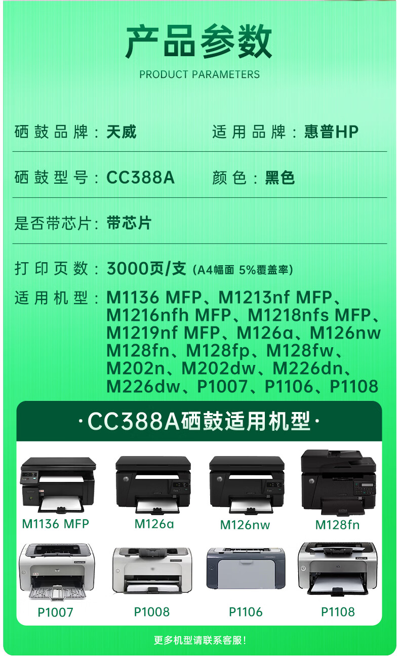 • 商品名称:天威388a硒鼓88a适用惠普m1136硒鼓 hp1108硒鼓 m126a m128fn p1007打印机p1106墨盒cc388a硒鼓 4支大容量 388/箱