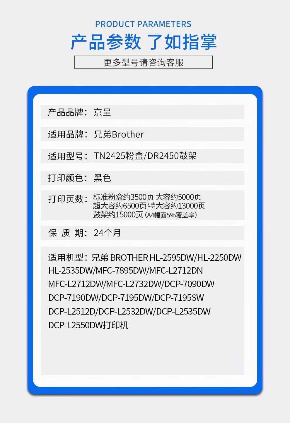 • 商品名称:京呈DCP-7190dw适用兄弟DCP-7090dw打印机DCP-L2535dw TN2425硒鼓2550DW DCP-7195DW TN2425标准版粉盒 2支装 TN2425/支