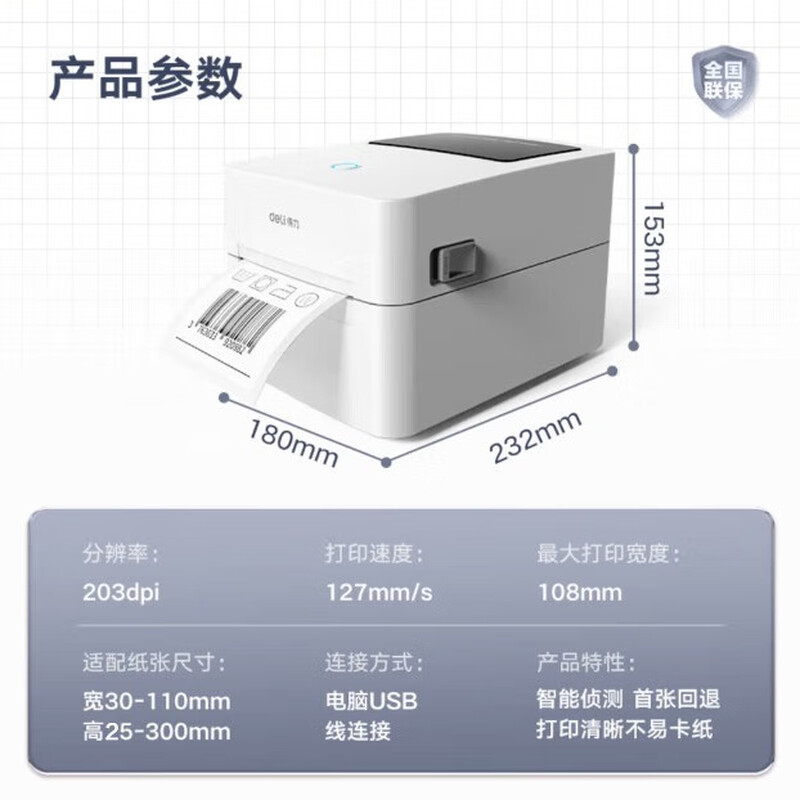 电脑、办公  > 办公设备  > 标签打印设备  >  得力/deli  >  得力(deli)DL-888B(NEW)热敏标签打印机 快递仓储物流面单固资108mm商用办公打单不干胶条码大纸仓打印 USB版 DL-888B(NEW)/台