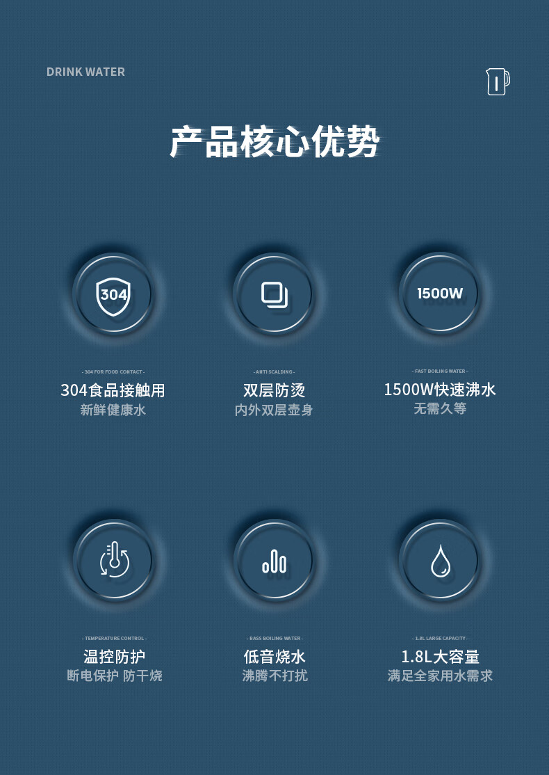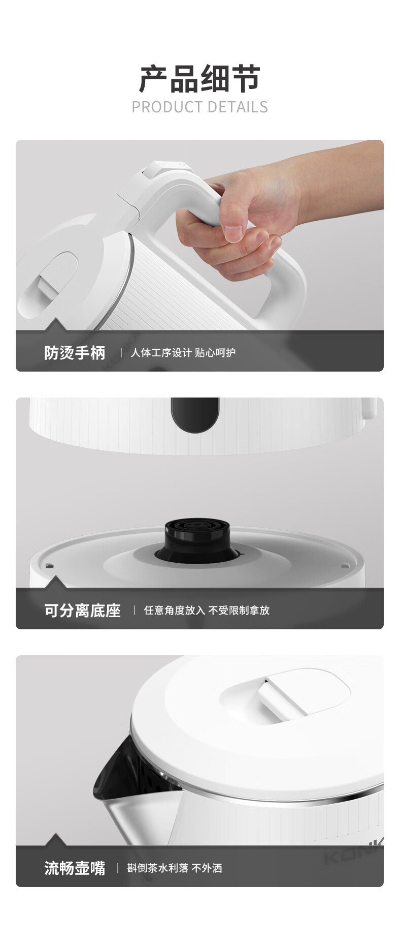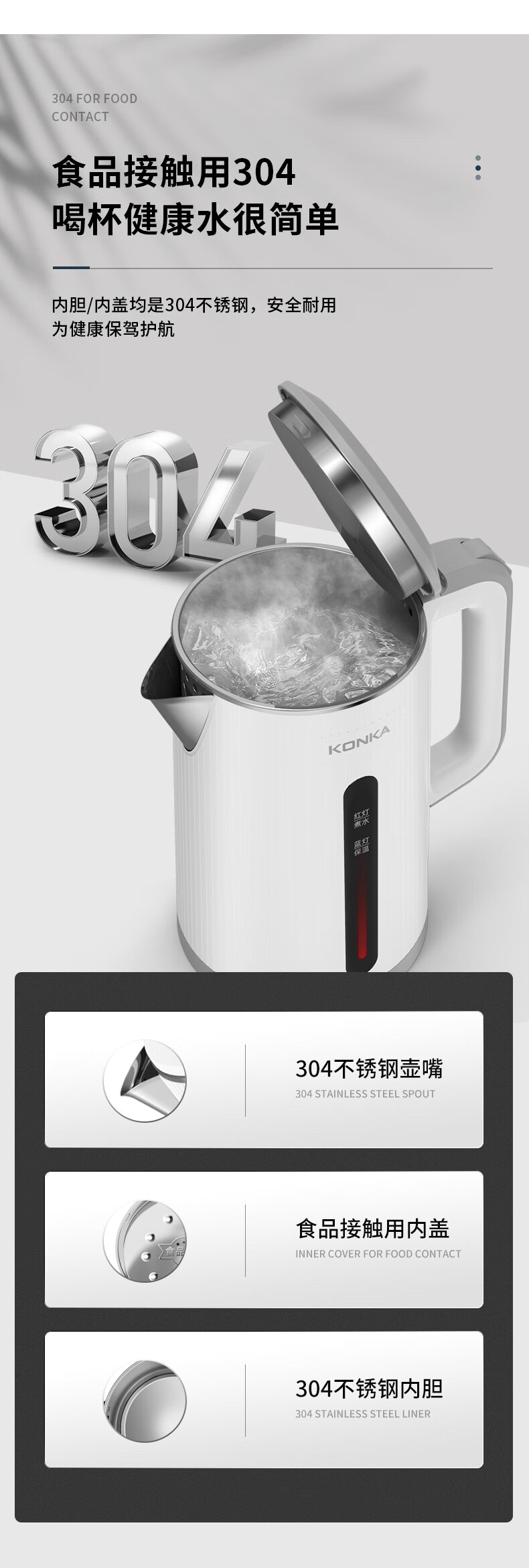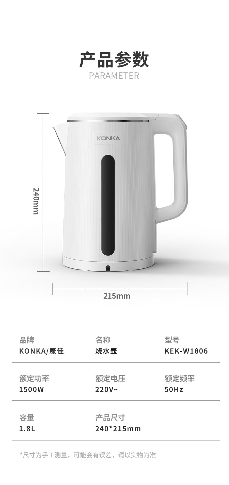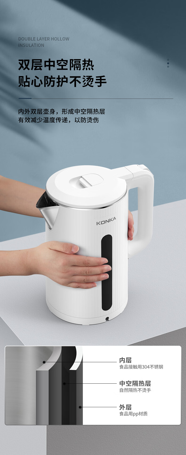 • 商品名称:康佳(KONKA)电热水壶 304不锈钢双层防烫 1.8L大容量 烧水壶暖水壶开水壶电水瓶 KEK-W1806 KEK-W1806/台