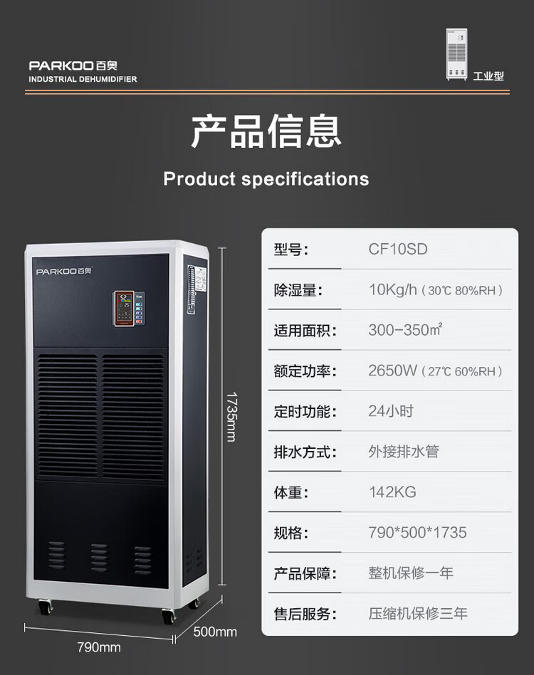 商品名称: 百奥(PARKOO)工业除湿机/抽湿机 除湿量240升/天 适用面积120-480㎡ 大面积大功率 工厂/车间 CF10SD CF10SD/台
