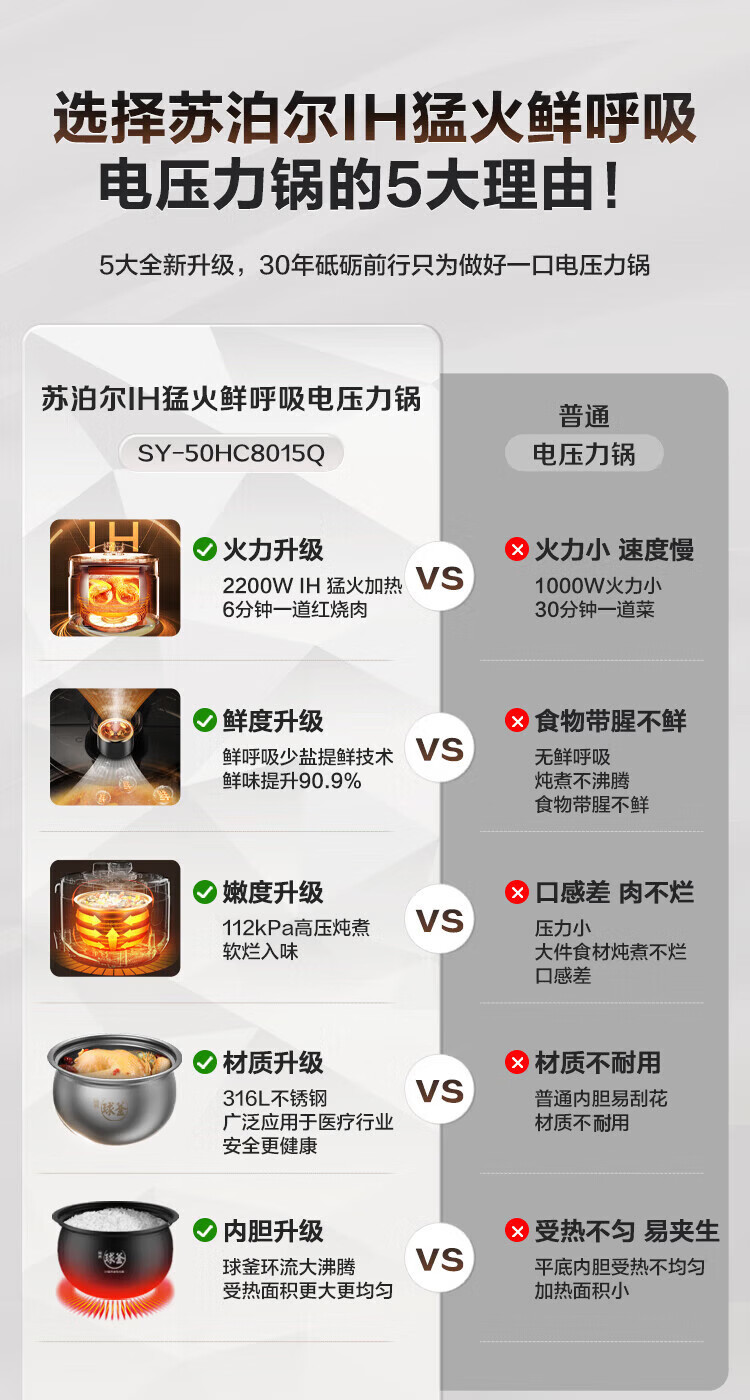 苏泊尔(SUPOR)IH鲜呼吸猛火电压力锅5L高压112kPa电饭煲高压锅4-6人家用316L球釜SY-50HC8015Q SY-50HC8015Q/台
