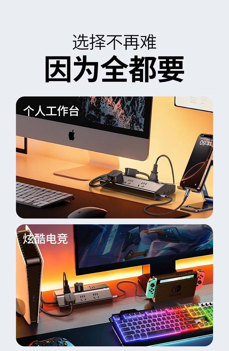 绿联T6插排新国标多功能usb梯形排插20W氮化镓快充插座过载保护电脑桌面充电站接插线板6位总控1.5米 T620/个