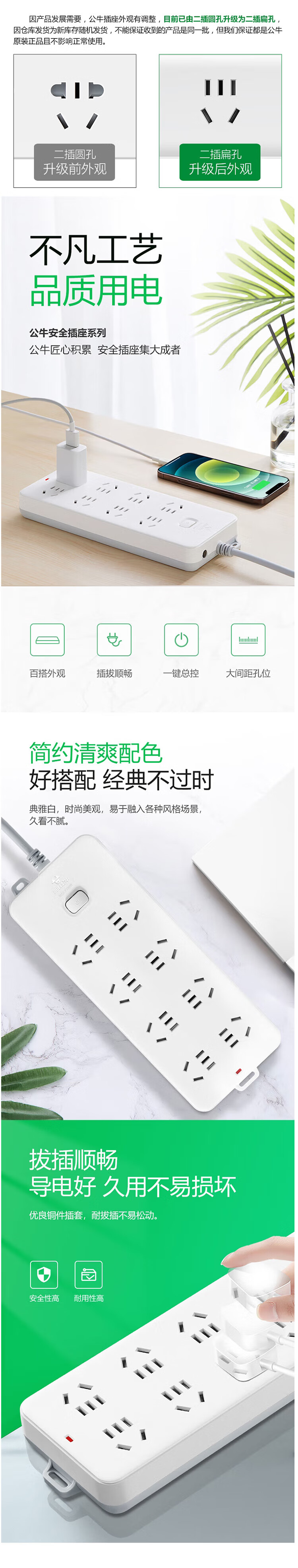 • 商品名称:公牛 GN-217 总控开关 新国标孔8位插座双排插 5米电源线10A GN-217/个