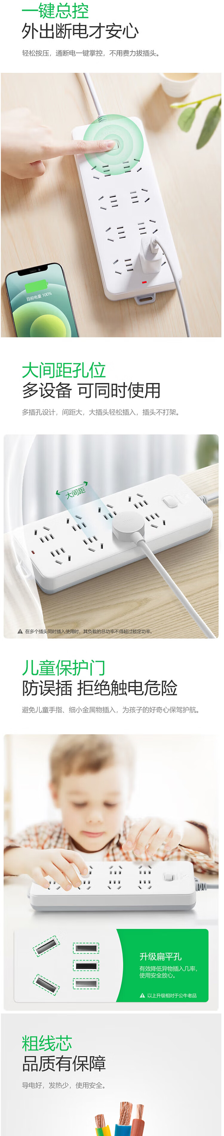 商品名称: 公牛 GN-217 总控开关 新国标孔8位插座双排插 5米电源线10A GN-217/个