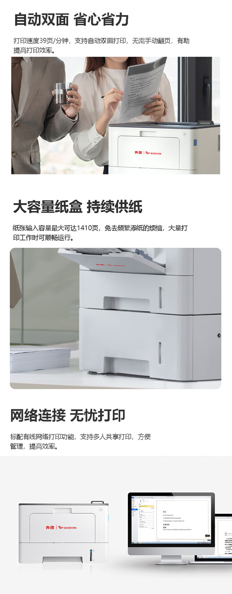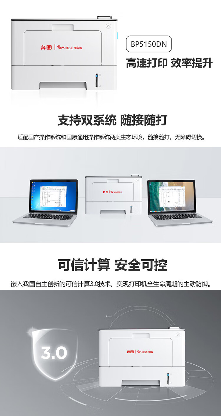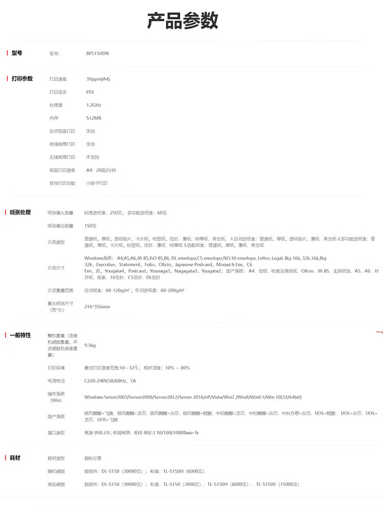 商品名称: 奔图(PANTUM) A4黑白激光单功能打印机 39ppm 自动双面打印 支持双系统激光打印机 BP5150DN 支持信创 BP5150DN/台