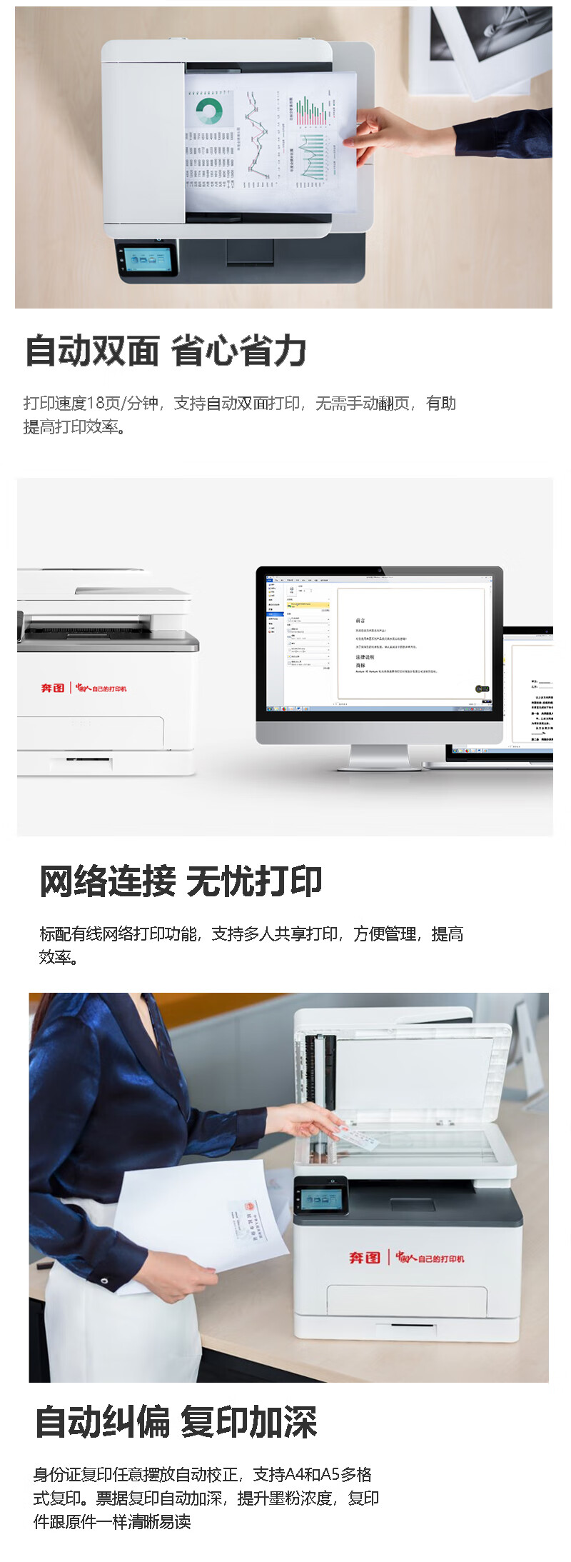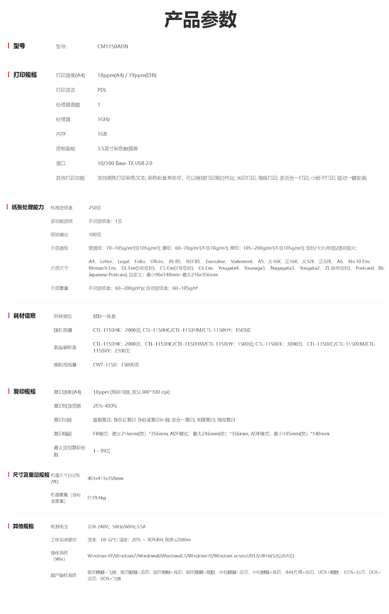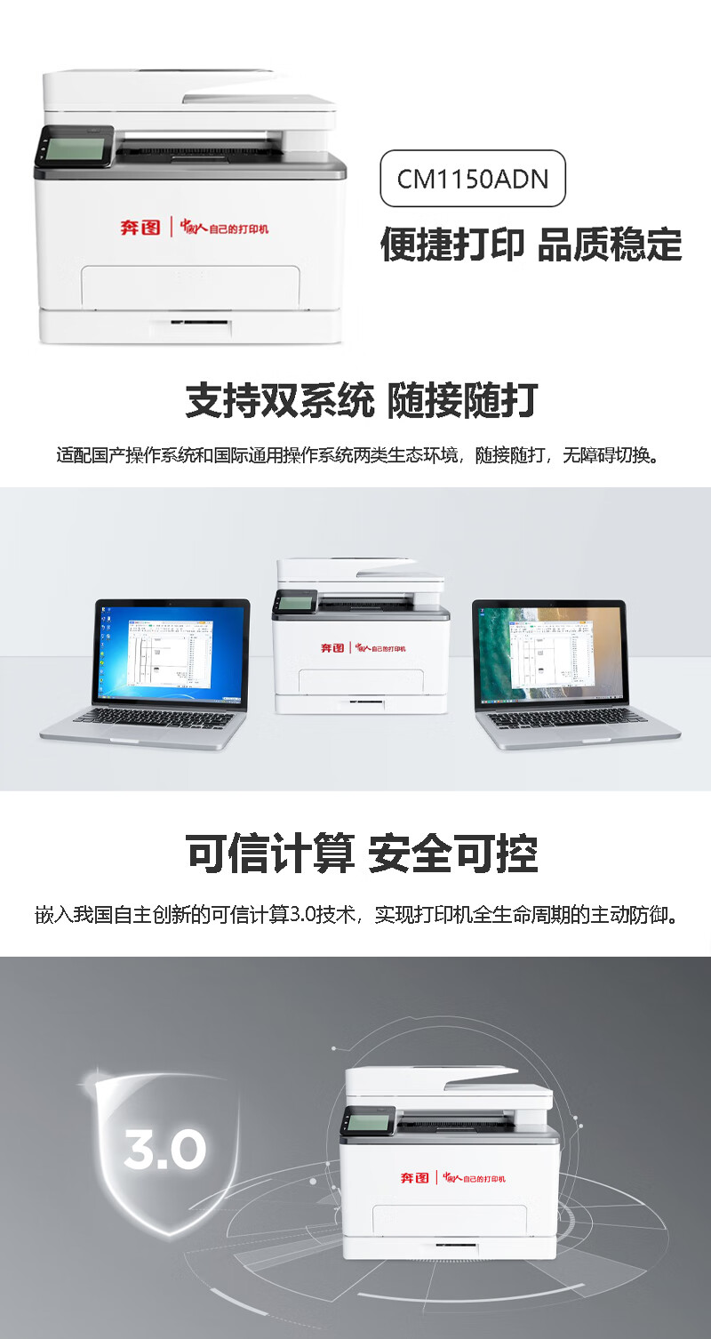商品名称: 奔图(PANTUM)CM1150ADN激光多功能一体机 A4彩色自动双面 18ppm 打印/复印/扫描 全国产化 CM1150ADN/台