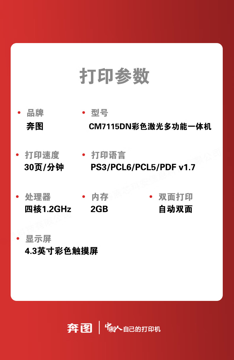 • 商品名称:奔图A4彩色多功能打印扫描一体机CM7115DN/A4幅面/网络打印/双面打印/三年保/国产型号 CM7115DN/台