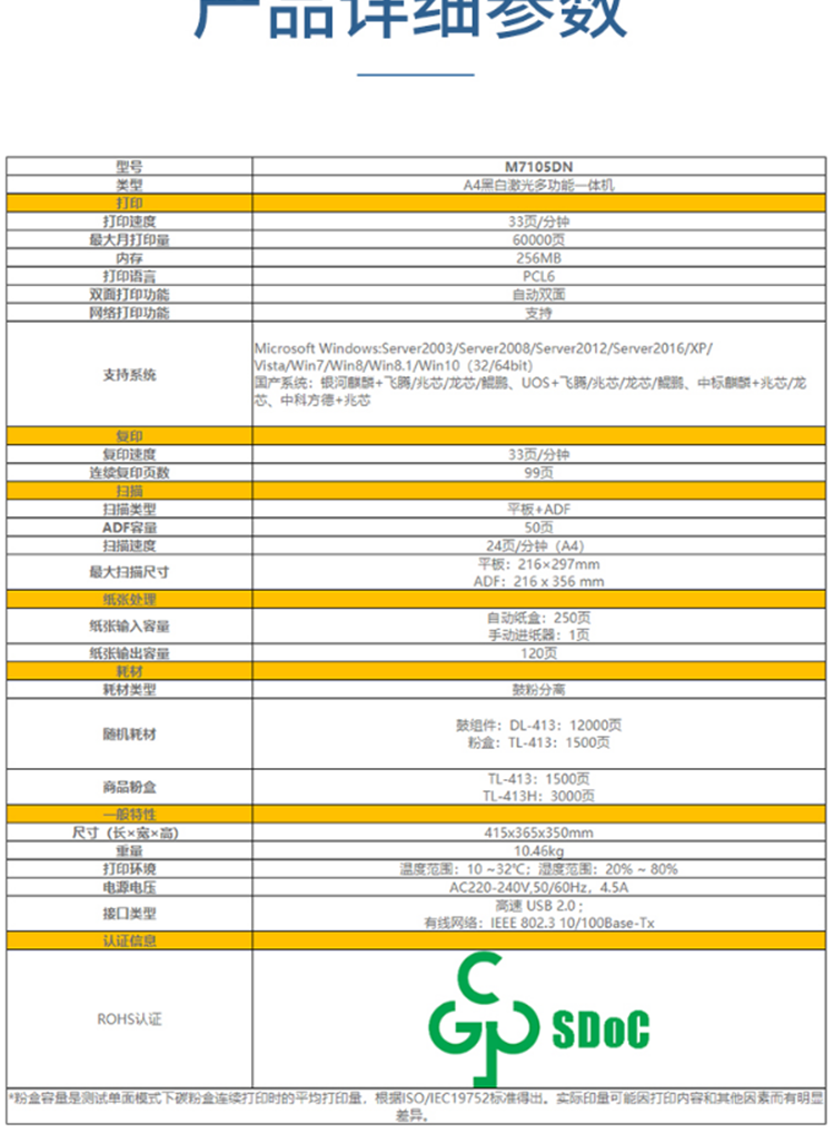 • 商品名称:奔图(PANTUM)M7105DN,黑白激光一体机,打印速度30ppm、USB+NET M7105DN/台
