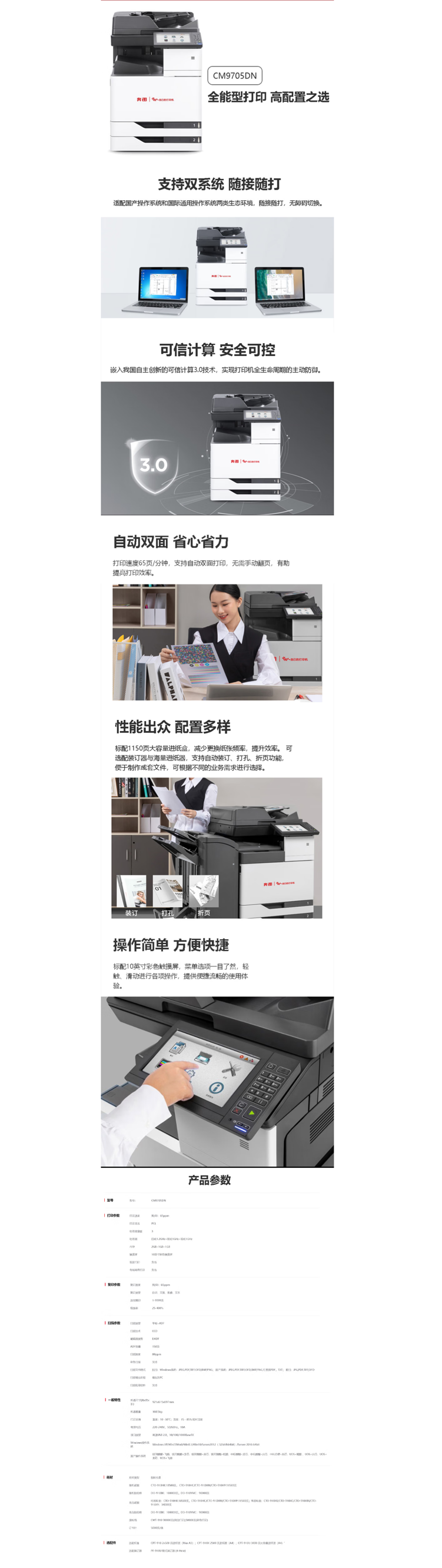 • 商品名称:奔图A3彩色多功能数码复合机打印机CM9705DN/A3幅面/双面打印(打印/复印/扫描)/三年保/国产型号 CM9705DN/台