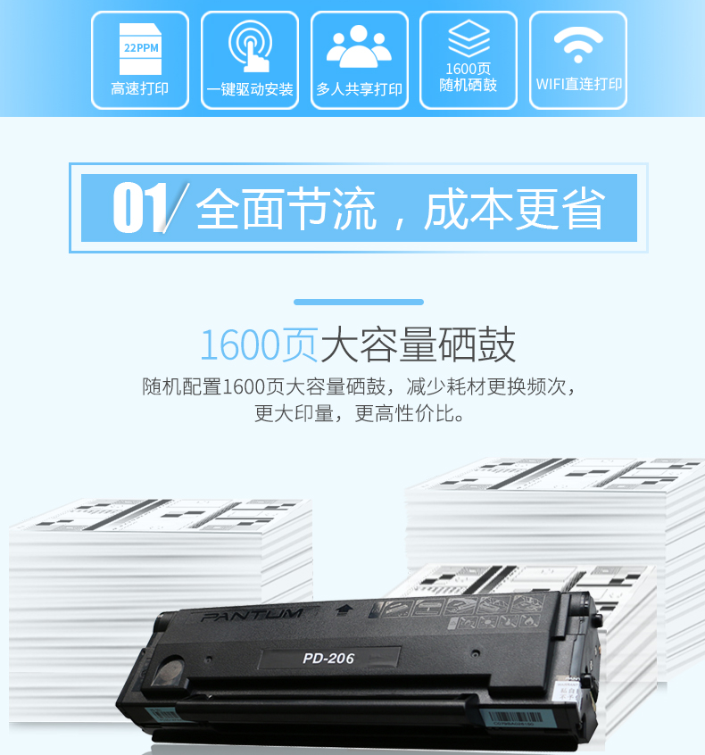 • 商品名称:奔图(PANTUM)A4黑白激光打印机 高速打印 共享打印 便捷打印 自动休眠 节能省电 P2506W USB+WIFI P2506W/台