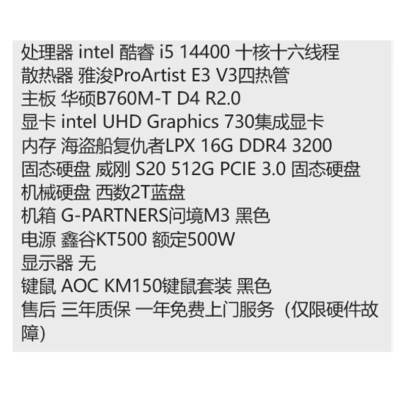 电脑、办公  > 电脑组件  > 组装电脑  >  华硕/ASUS  >  华硕组装机 i5-14400 16G内存 2T机械 台式机w 组装机/台