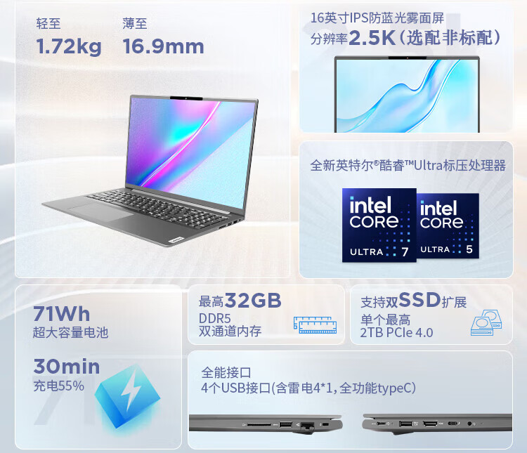 电脑、办公  > 电脑整机  > 笔记本  >  联想/ThinkBook  >  联想 昭阳·悦Max16 标压Ultra5 16G内存 1TB固态 锐炫核显16英寸屏商务办公AI创作学习笔记本定制升级 昭阳 X5-16/台