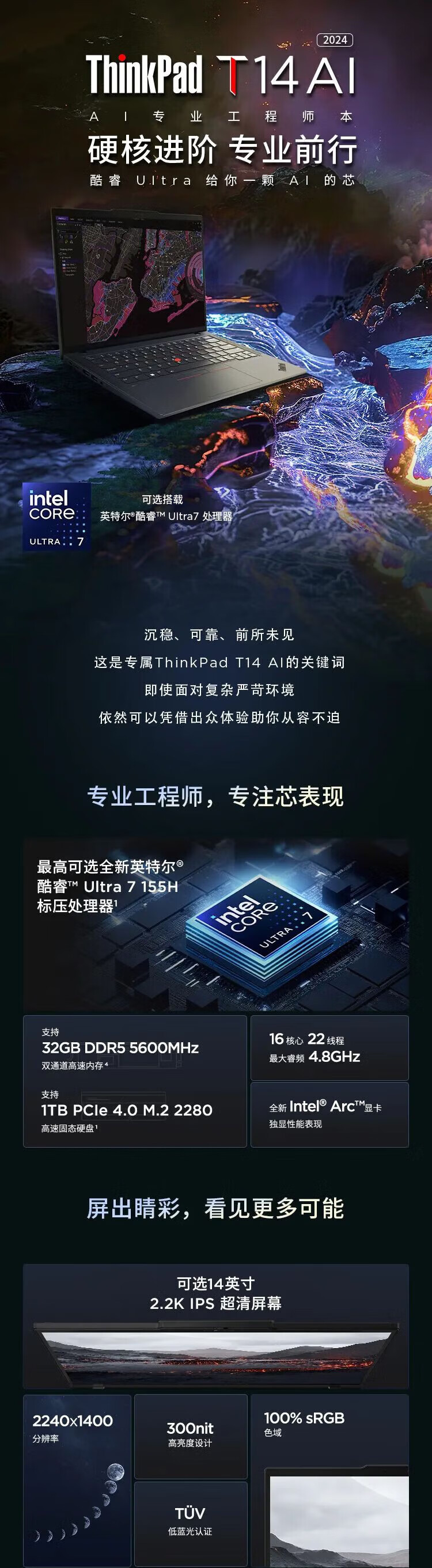 商品名称: ThinkPad T14 AI Gen5 14英寸T系列工程师高性能轻薄本笔记本电脑 定制:UItra7-155H 64G 1TB 4G互联 2.2K T14/台